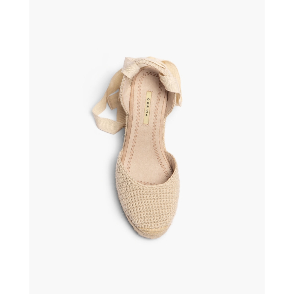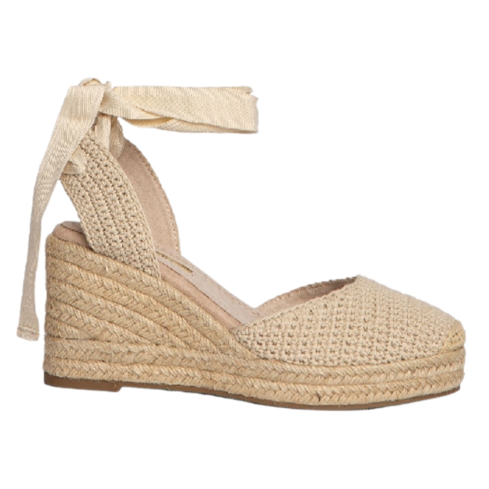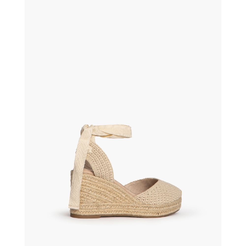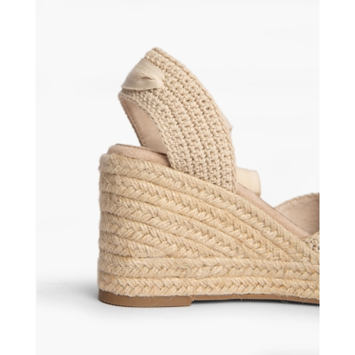 Plataforma tipo valenciana, con cuña en yute. Corte acabado en redondo en ganchillo. Cie-re mediante tiras anudadas al tobillo.