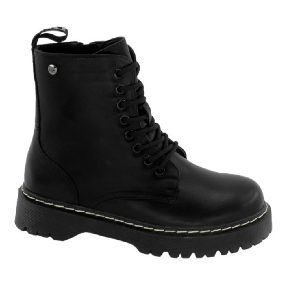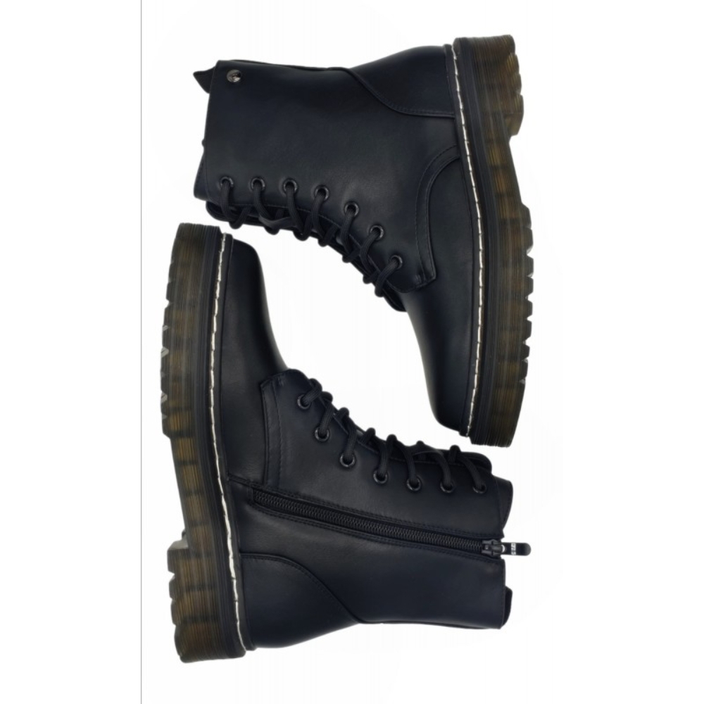 Botín motera, militar de mujer destinado a poner el broche perfecto a tus outfits. Cierre con cordones en la parte frontal y cremallera en el lateral .