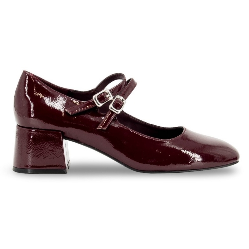 Zapato con tacón estilo salón para mujer. Fabricado con tacon cuadrado y ancho. Cierre con dos hebillas para un mayor ajuste acorde con las lineas de moda. Color burdeos