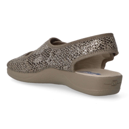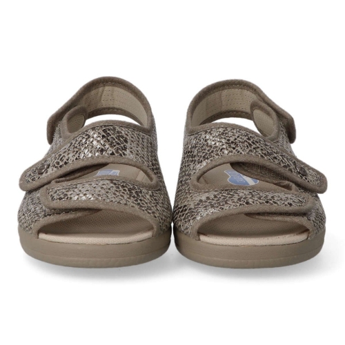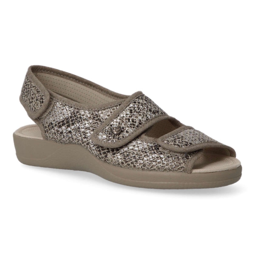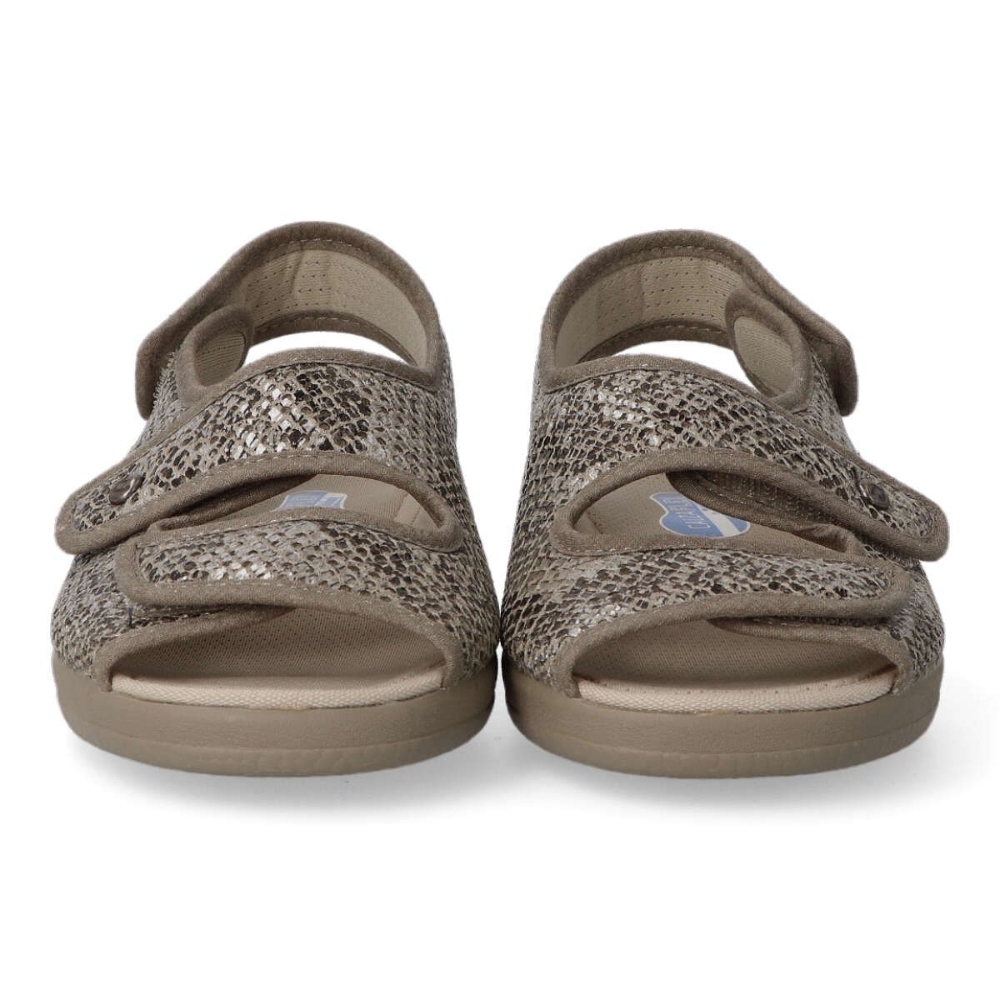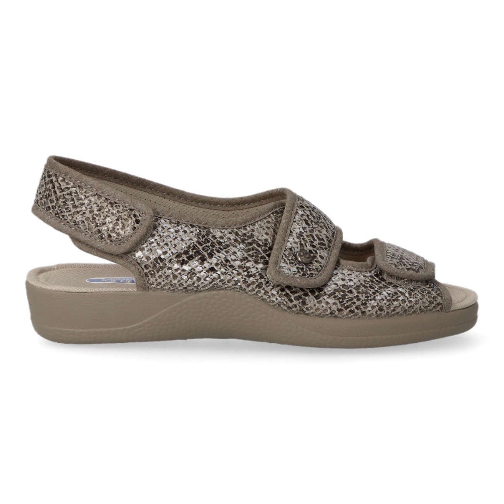 Zapatilla cómoda de mujer. Piso de caucho natural y antideslizantes. Plantilla de espuma látex. Tejidos transpirables. Disponible en color arena print serpiente. Plantilla antibacterias. Pala de doble velcro ajustable. Altura 3 cm. Hecho en España.
