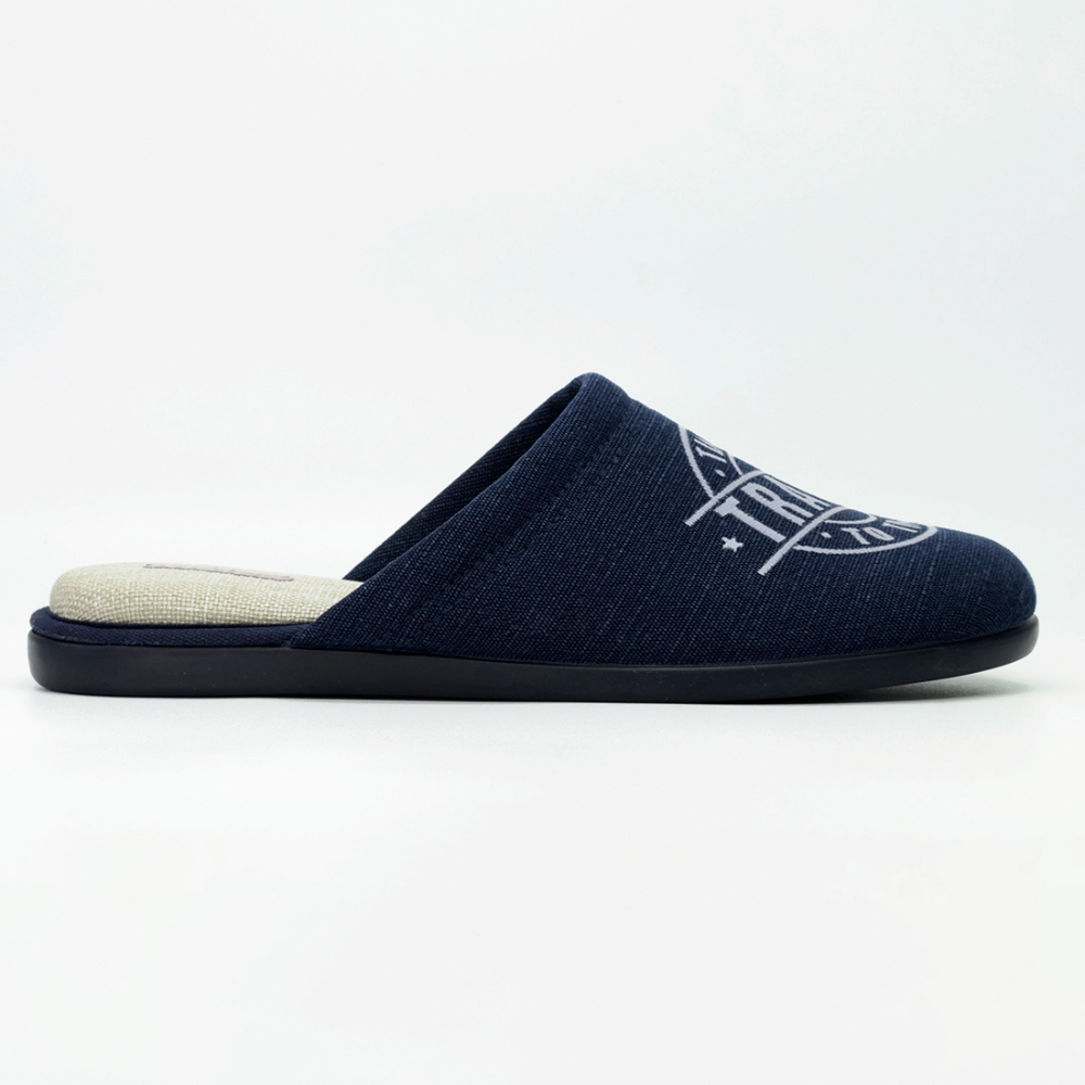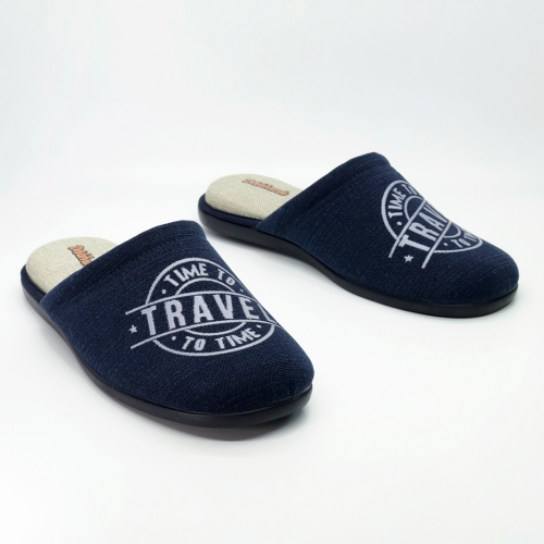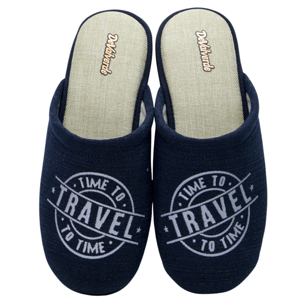 Zueco para hombre de la marca Devalverde, fabricado en material textil de color azul marino. Este modelo destaca por su cómodo diseño abierto en el talón y su empeine suave con un estampado circular con el mensaje "Time to Travel". La plantilla interior presenta un acabado texturizado en tono beige que favorece la transpiración y el confort. Su suela flexible garantiza una pisada segura y ligera. Un calzado ideal para el descanso y el uso diario