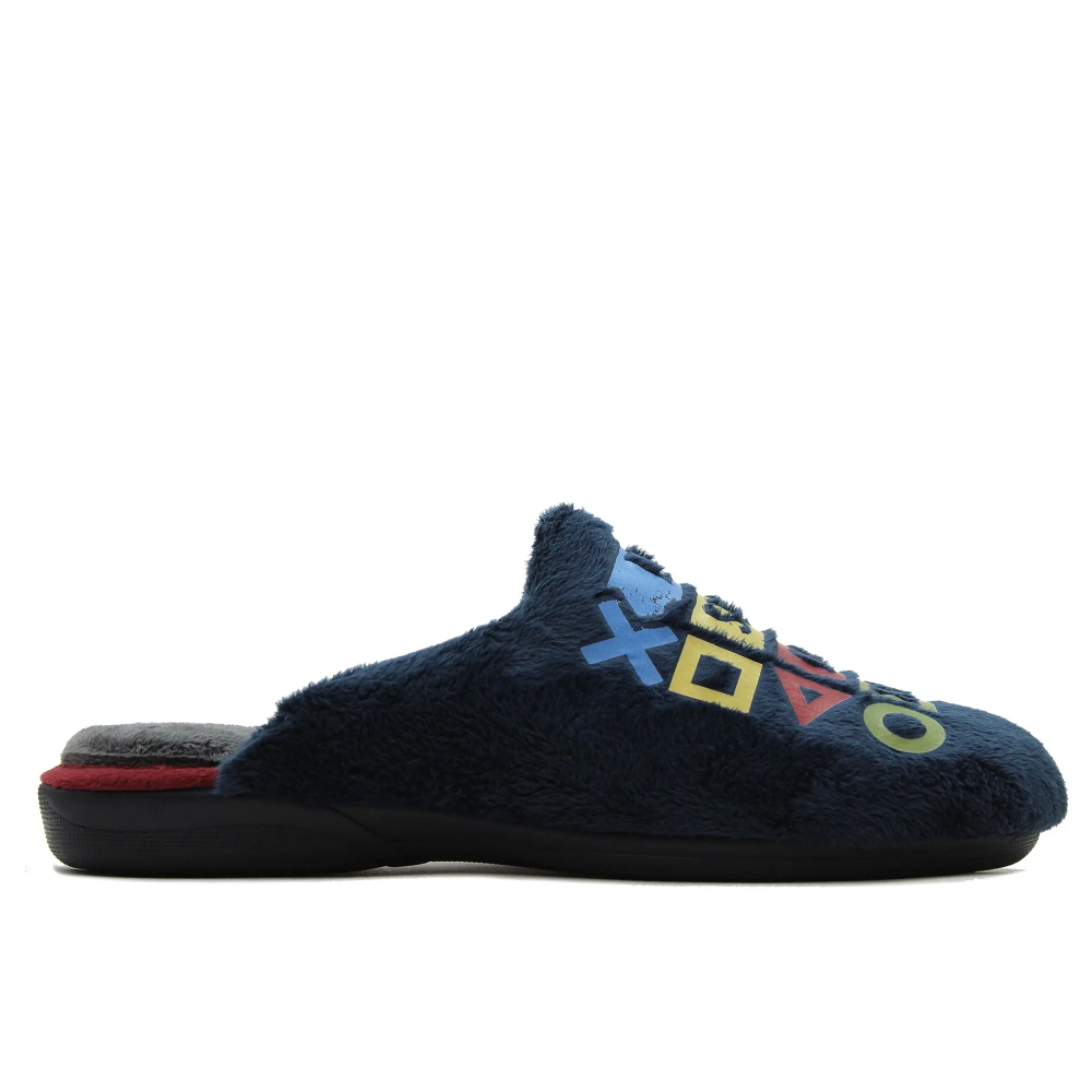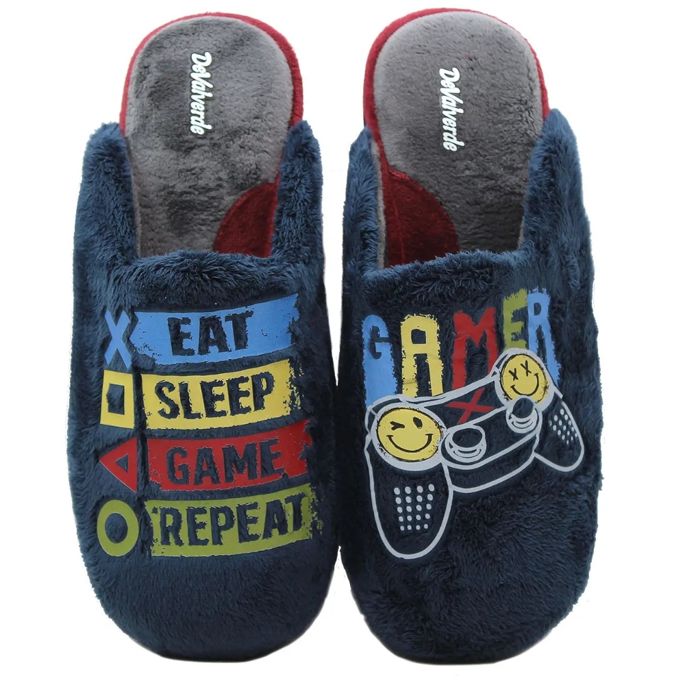 Zapatillas de casa para hombre con talón abierto y dedos cuebiertos, de la marca Devalverde, decoración Gamer con mando y botones de videoconsola, también tiene la frase: Eat Sleep Game Repeat, pantufla hecha en España en textil, Chinela con forro interior en textil y suela de goma muy cómoda.Piso con grabado especial rugoso para evitar posibles deslizamientos. Fabricada con tejidos en microfibras y algodón que permiten una constante ventilación. Suela con relleno de corcho natural para una total absorción de los posibles impactos. Utilizando materiales que cuidan al máximo posible el medio ambiente. Hecho en España. Lavables a mano. Otoño invierno.