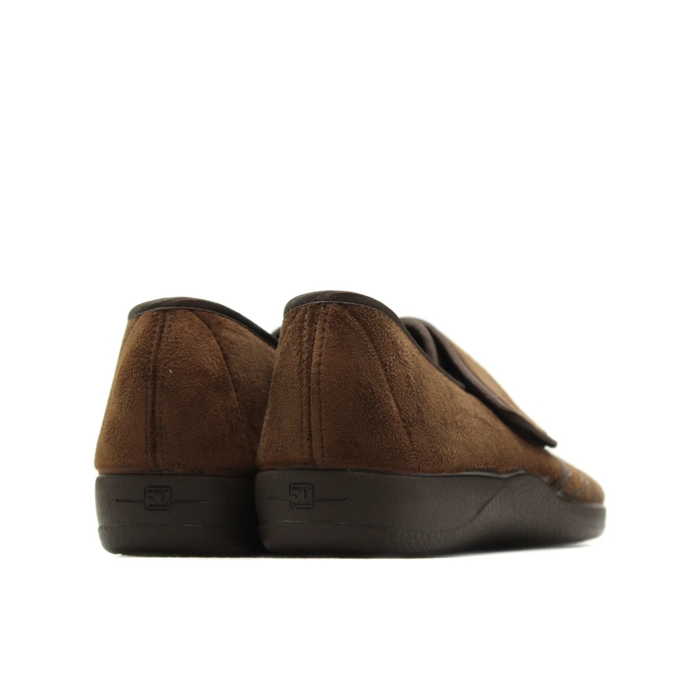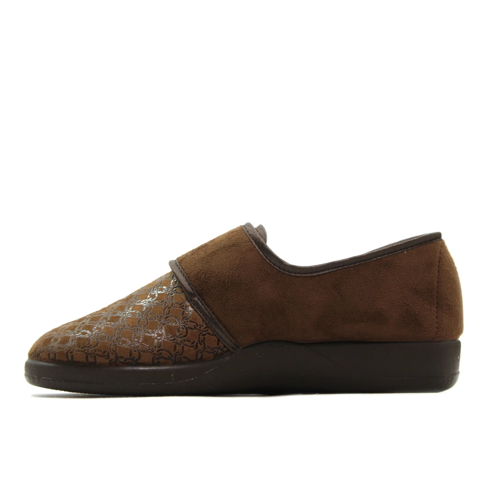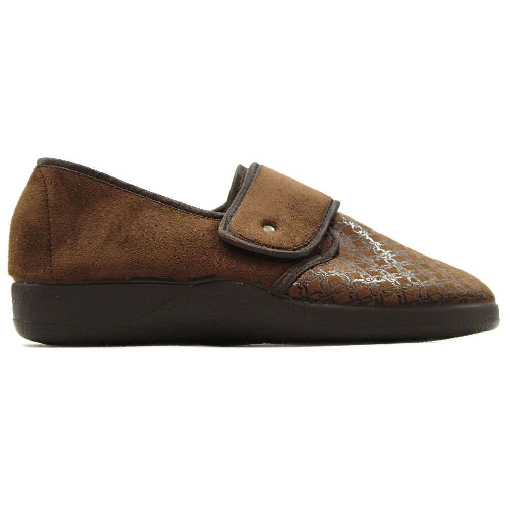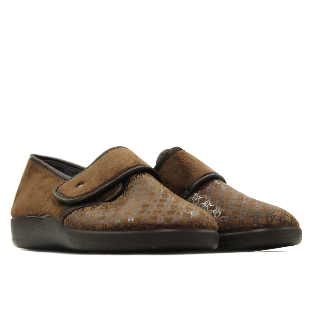 Pantuflas de casa cubierta, de la marca Devalverde 1109 color marrón , cierre mediante tira adhesiva en el empeine para una mejor adaptación, con forro interior en textil y suela de goma antideslizante. Ideal para mantener tus pies calentitos en invierno. Zapatilla de casa cerrada para mujer, piso con grabado especial rugoso para evitar posibles deslizamientos. Fabricada con tejidos en microfibras y algodón que permiten una constante ventilación. Relleno de corcho natural para una total absorción de los posibles impactos. Plantilla de espuma látex que controla los cambios de temperatura y humedad. Plantilla de espuma látex con mayor componente antibacteriano. Respetuosos con la naturaleza. Utilizando materiales que cuidan al máximo posible el medio ambiente. Componentes más resistentes al lavado, la fricción y el agua, lavables a mano. Hecho en España. Modelo de ancho especial. Cierre mediante tira adhesiva.