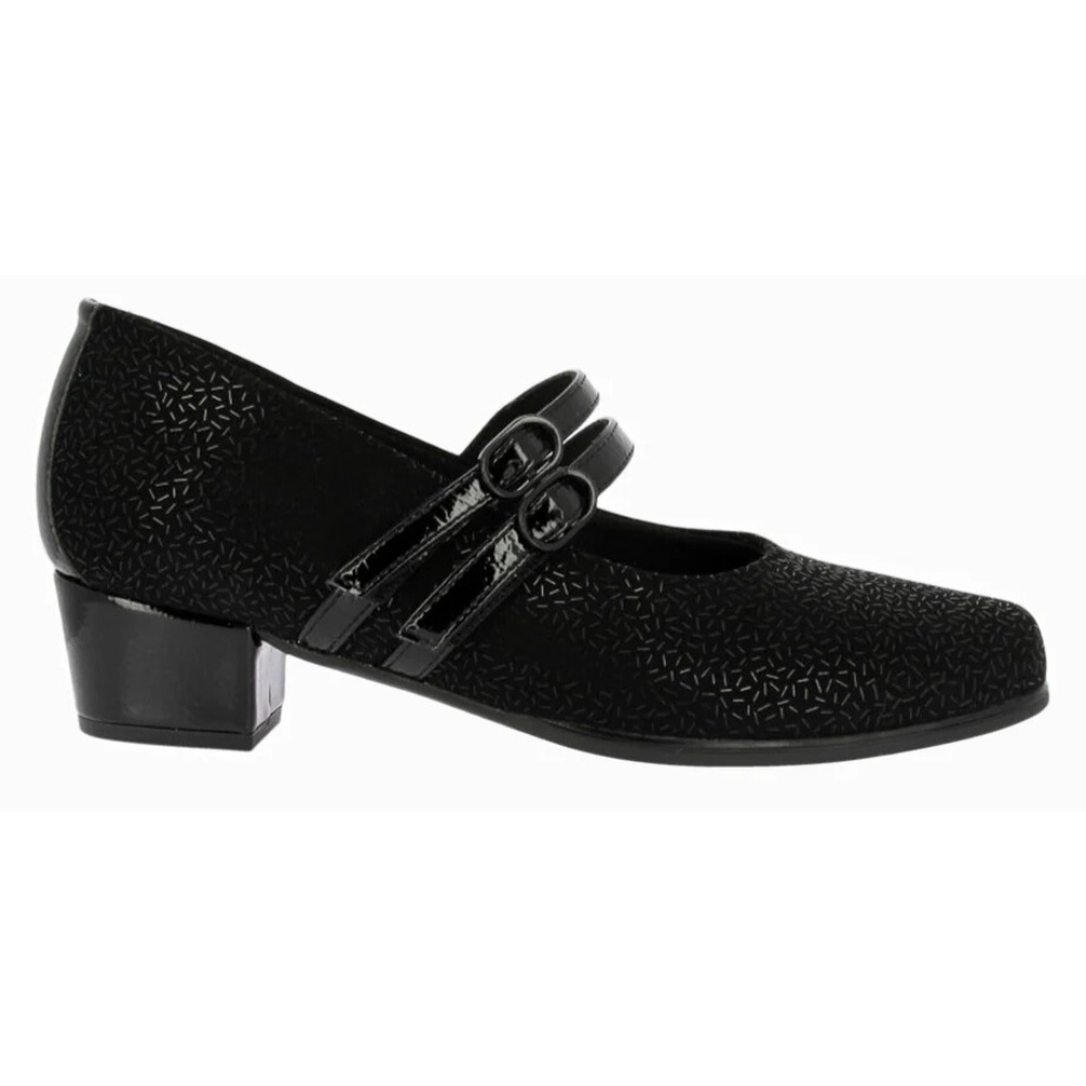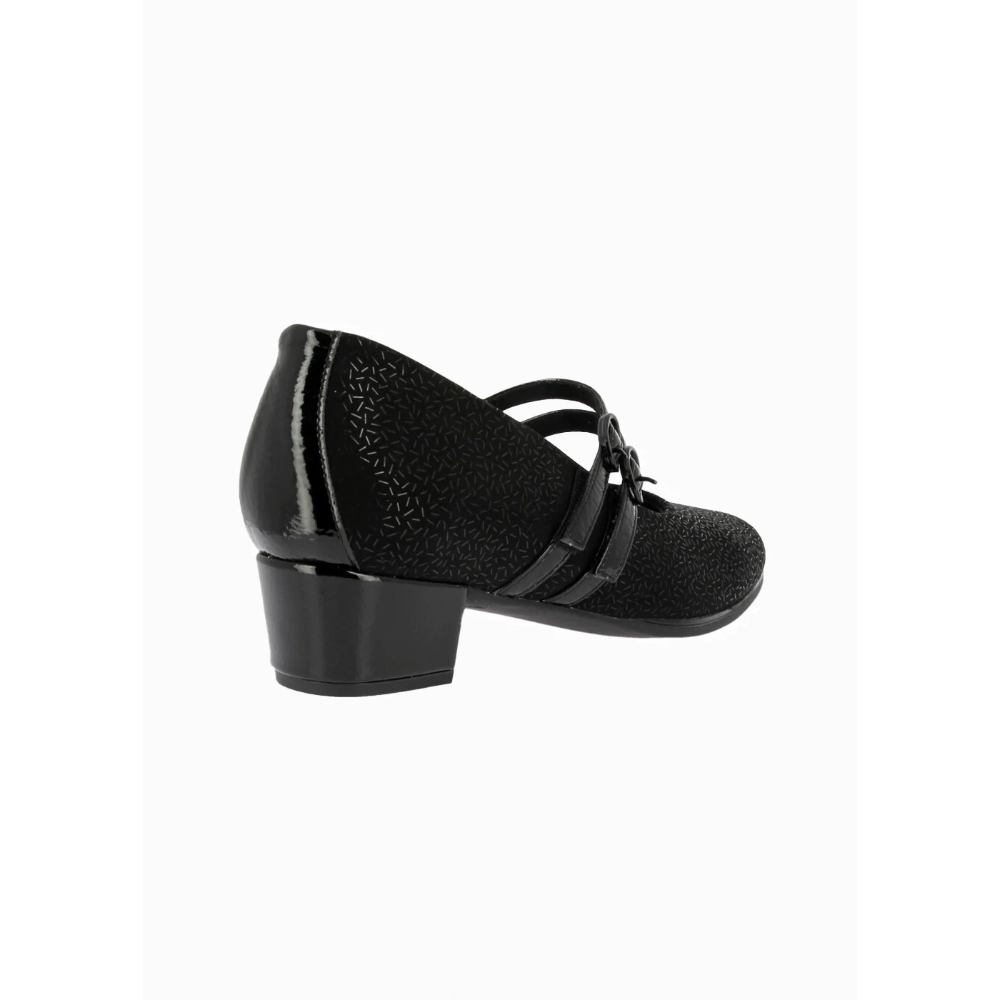Zapato de tacón para mujer de corte mary jane con ancho especial. Fabricado en una combinación de piel y textil grabado. Cuenta con doble cierre de velcro, hebillas decorativas, tacón forrado y plantilla de piel extraíble.