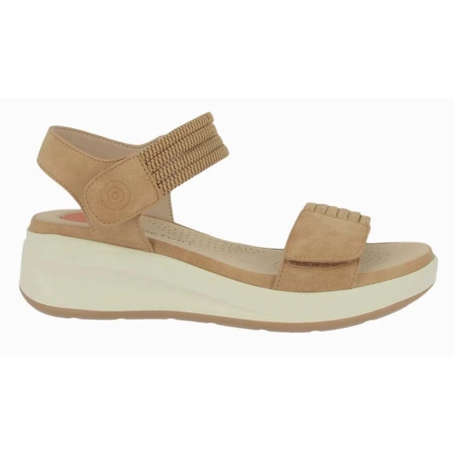 Sandalia de cuña para mujer de piel vegana en color camel. Su diseño de pala con velcro y cierre de velcro en el tobillo, garantiza un ajuste personalizado. Combina piel vegana y tiras elásticas con suela de goma ligera y flexible.
