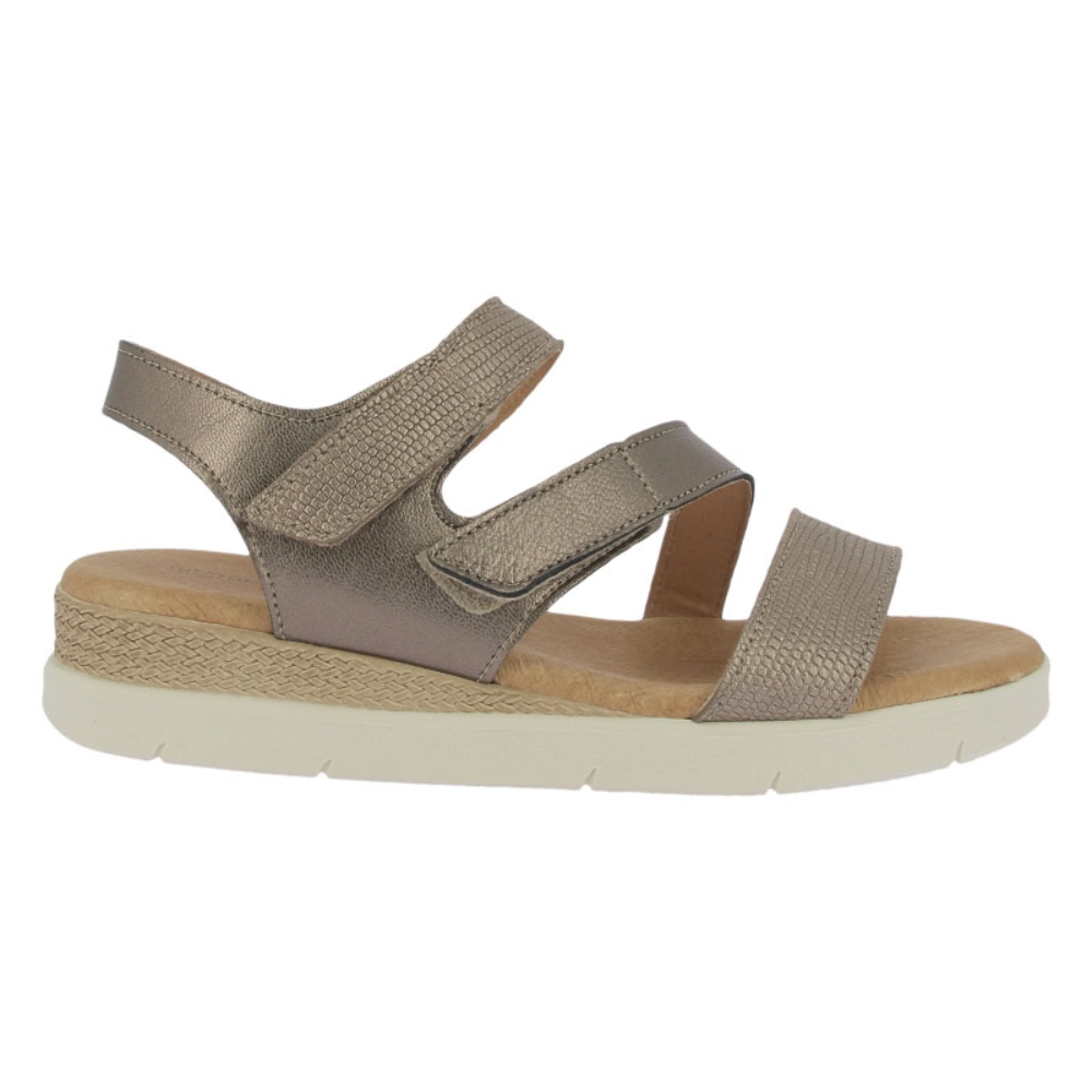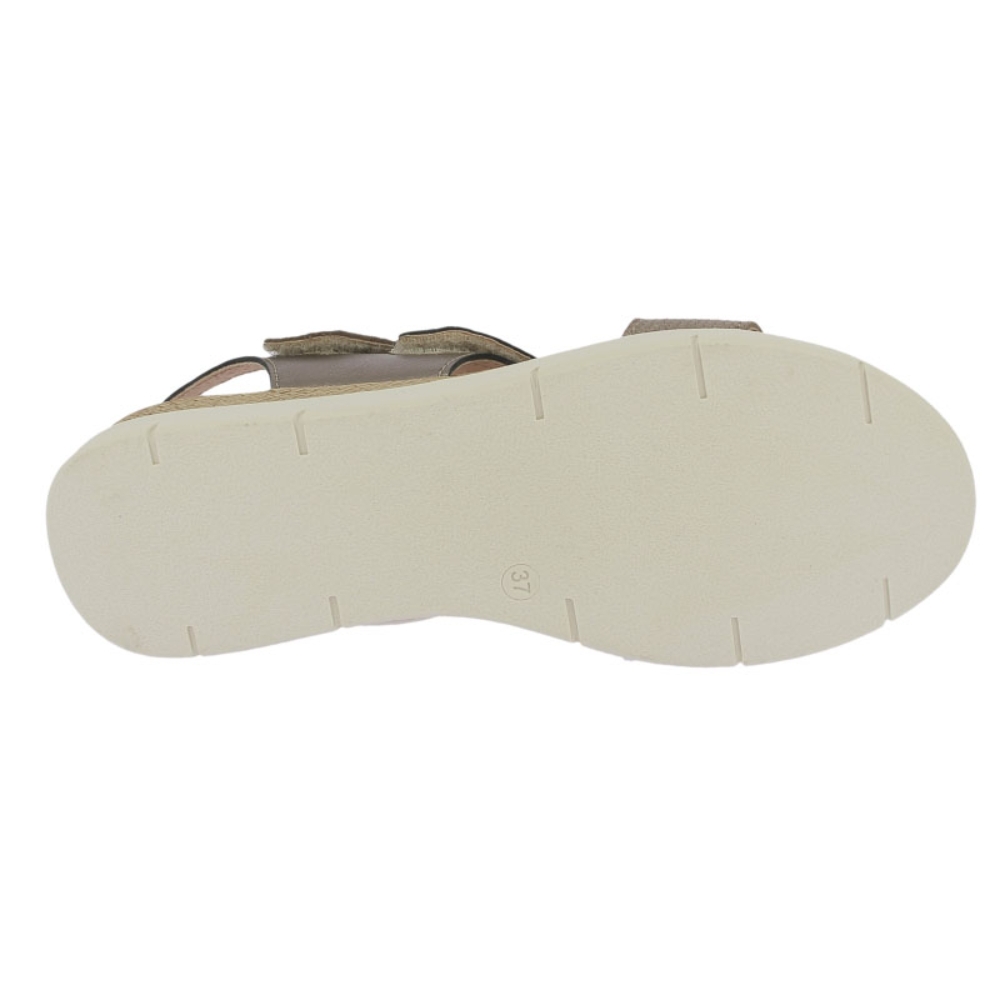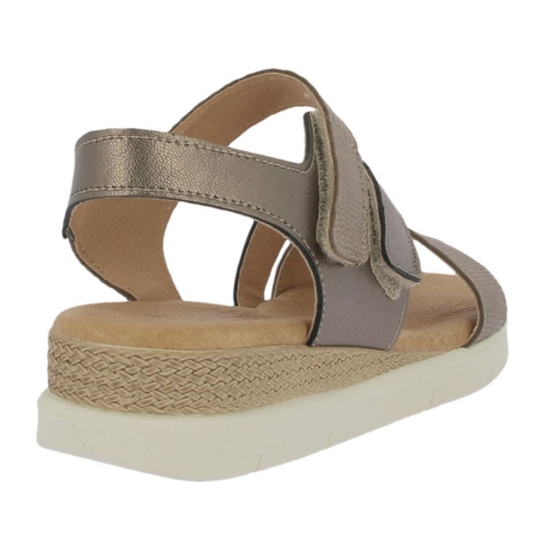 Sandalia de cuña de mujer fabricada en piel con tiras cruzadas en color bronce. Cuenta con forro y plantilla de piel, doble cierre de velcro y suela combinada.