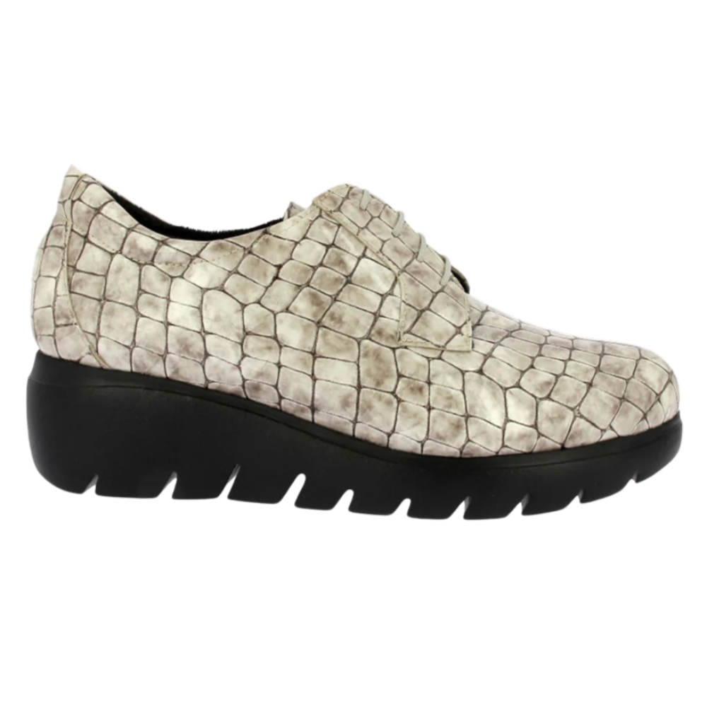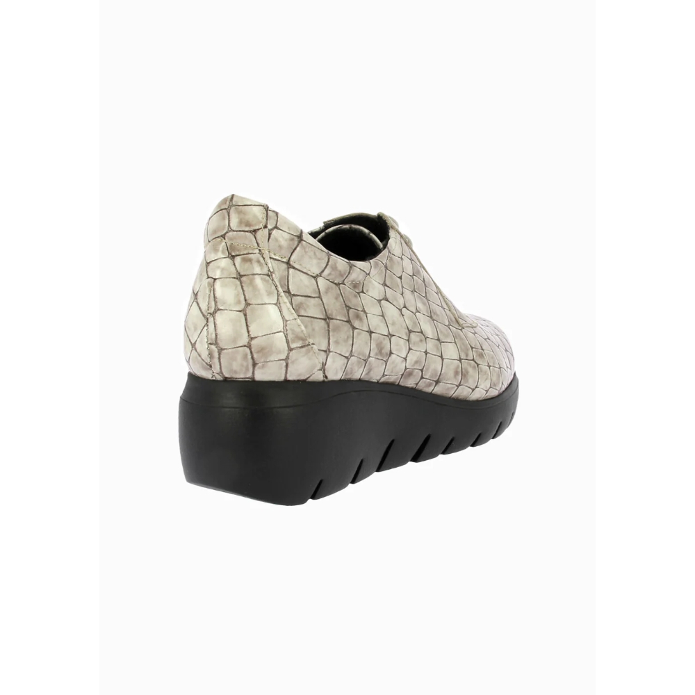 Zapato para mujer tipo inglés de piel grabada efecto serpiente en color niebla. Cuenta con suela dentada de cuña, forro Aloe Vera y cierre de cordones. El tejido Aloe vera tiene las siguientes propiedades: hidrata y suaviza la piel, es un antiséptico natural, actúa como antinflamatorio, elimina células muertas de la piel y favorece la salud del tejido. Además contiene iones de plata con poder anti bacteriano.