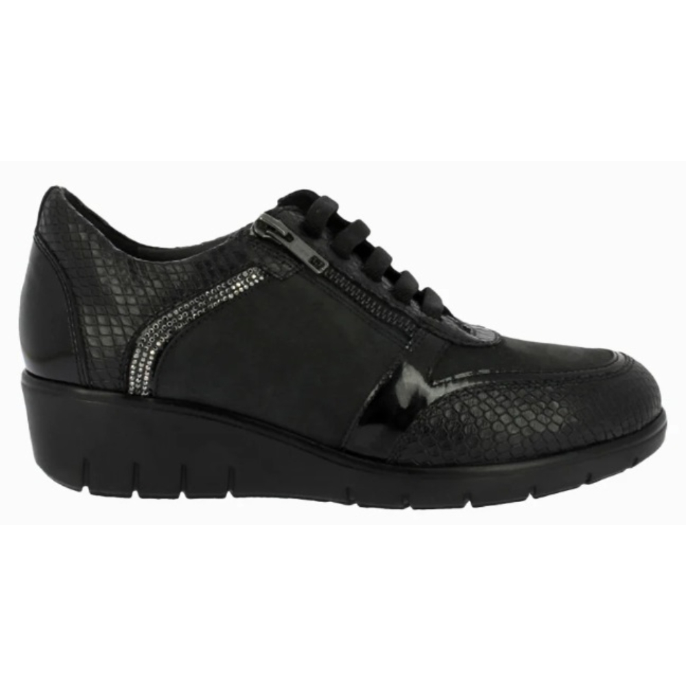 El Zapato 60351 para mujer en color negro combina elegancia y confort con su acabado en piel lisa y detalles en charol y grabado efecto serpiente. Diseñado para el día a día, ofrece cordones elásticos y cremallera lateral para un ajuste fácil, plantilla extraíble y forro suave que garantiza comodidad prolongada. Su suela de cuña con goma antideslizante proporciona seguridad y estabilidad en cada paso, convirtiéndolo en la elección perfecta para la temporada de otoño-invierno con estilo y funcionalidad.
