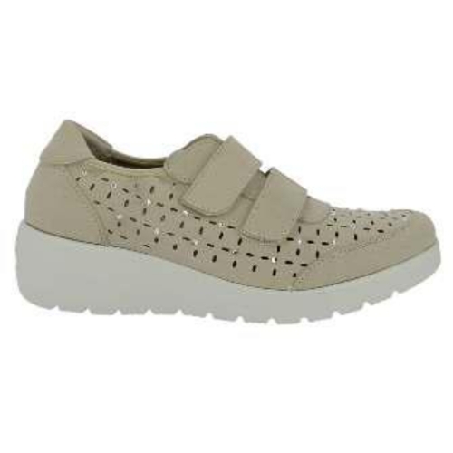 Deportivo para mujer de material vegano con picados y detalle de brillos en color platino. Cuenta con puntera y talón reforzados, cierre de doble velcro en el empeine, plantilla extraíble Memory Foam y suela de eva ligera.