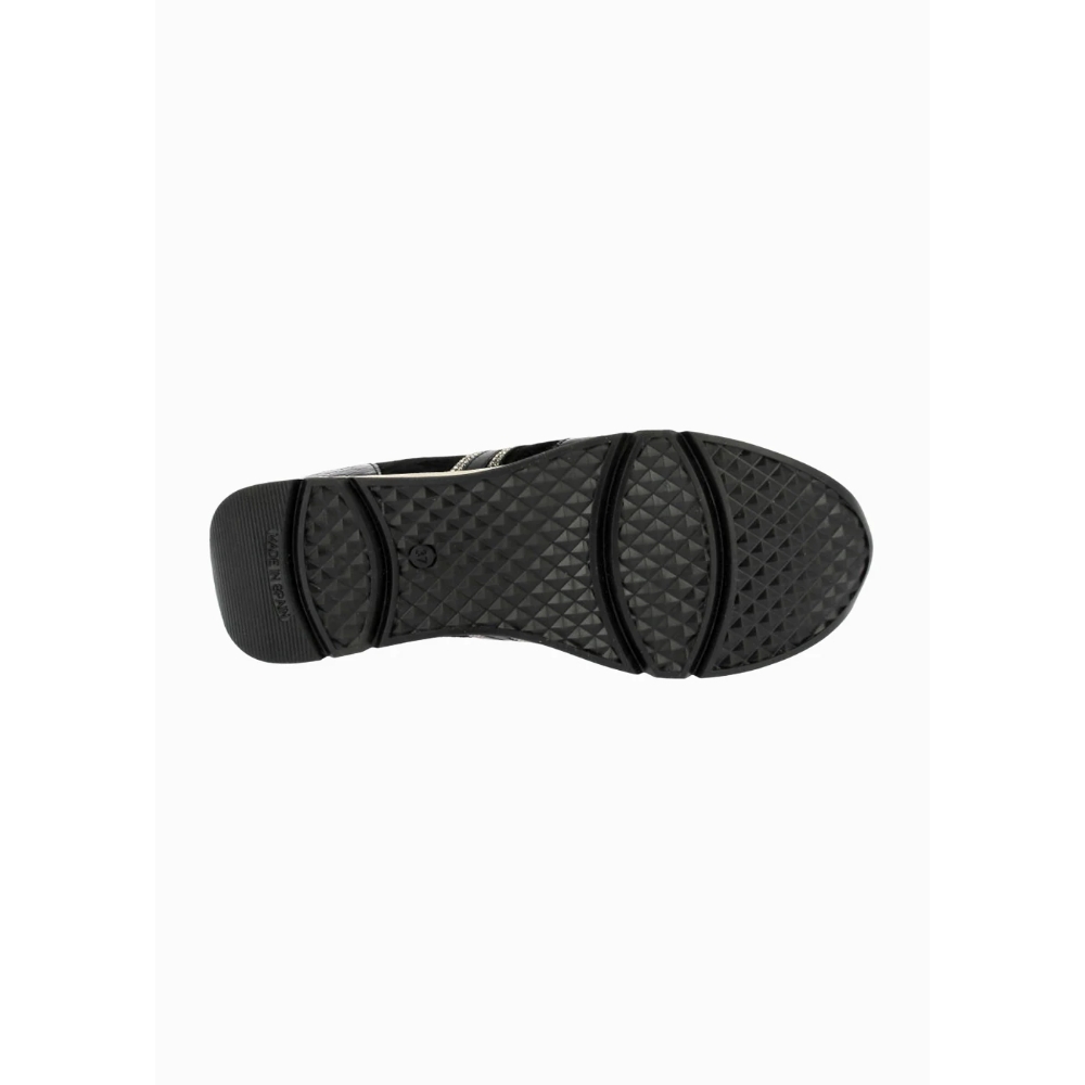 Zapato para mujer tipo deportivo fabricado en combinación de piel lisa y estampada en color niebla. Cuenta con detalle de banda lateral con brillos, cierre de cordones elásticos, plantilla extraíble y suela ligera dentada.