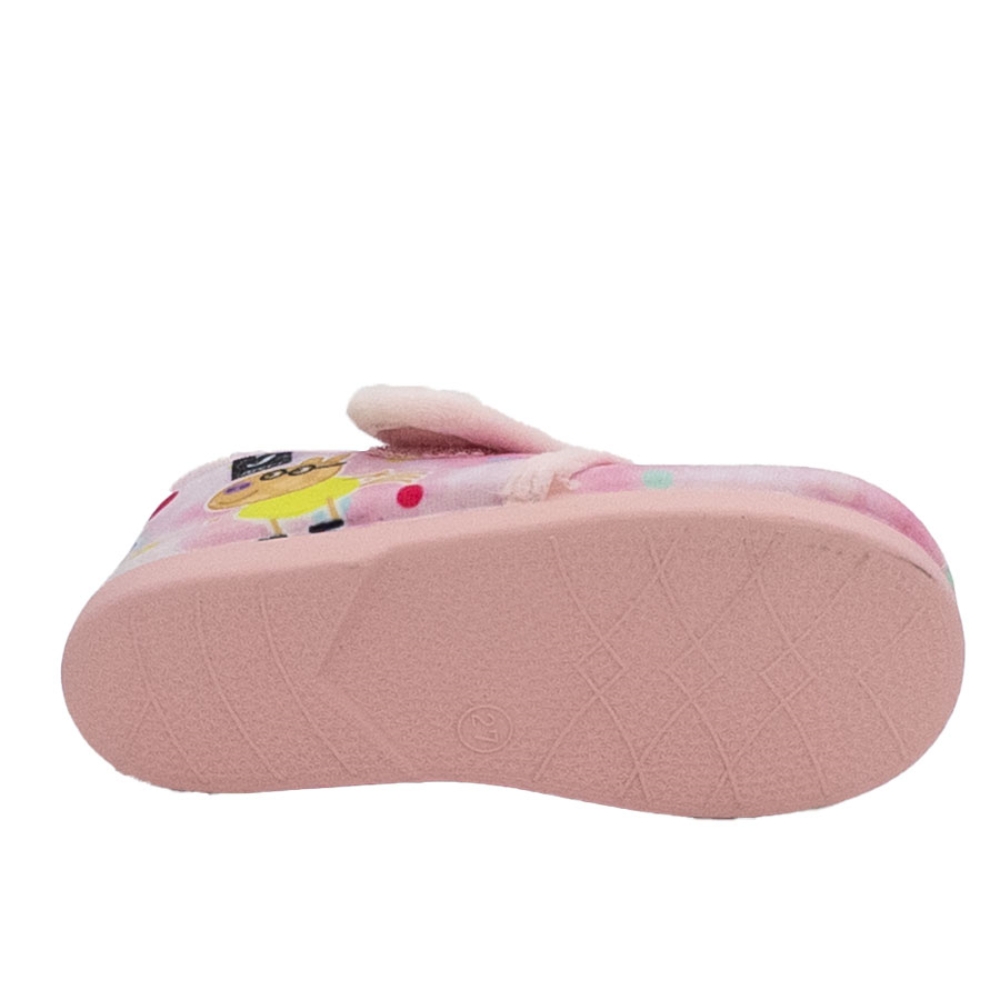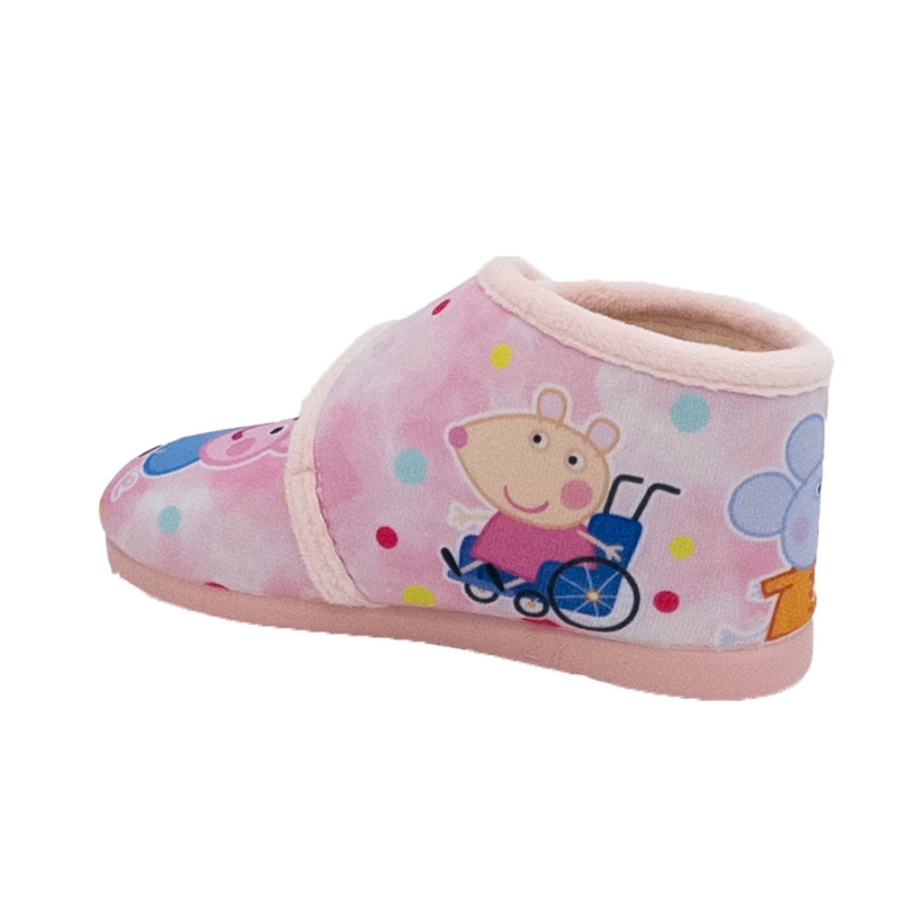 Zapatilla de casa para niños, muy cómoda, estilo botita con práctico autocierre, que nos facilitará su calce y ajuste en el pie, corte en tejido textil suave y estampado, de color rosa. Adornos: serigrafías de peppa pig y george jugando con sus amigos en distintos colores y ribete al tono, en tejido textil suave imitación terciopelo. Forro y planta en tejido textil suave, de color carne. Suela de goma al tono.
