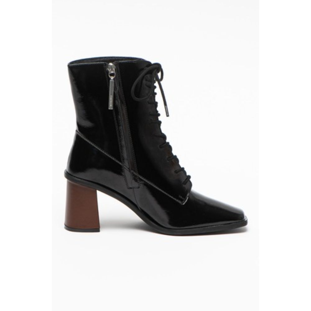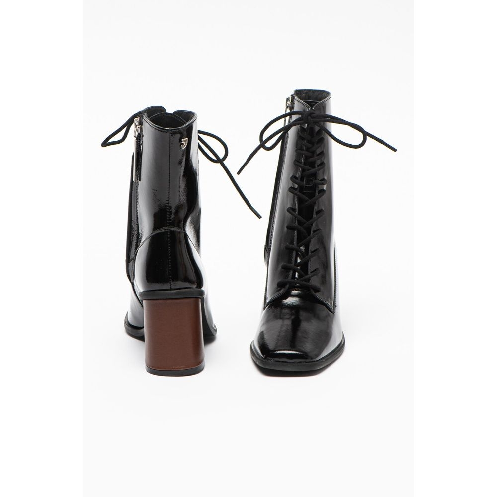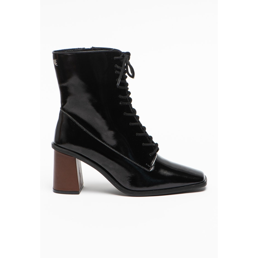 Botín de tacón medio-alto con cordón, fabricado en piel tipo charol.