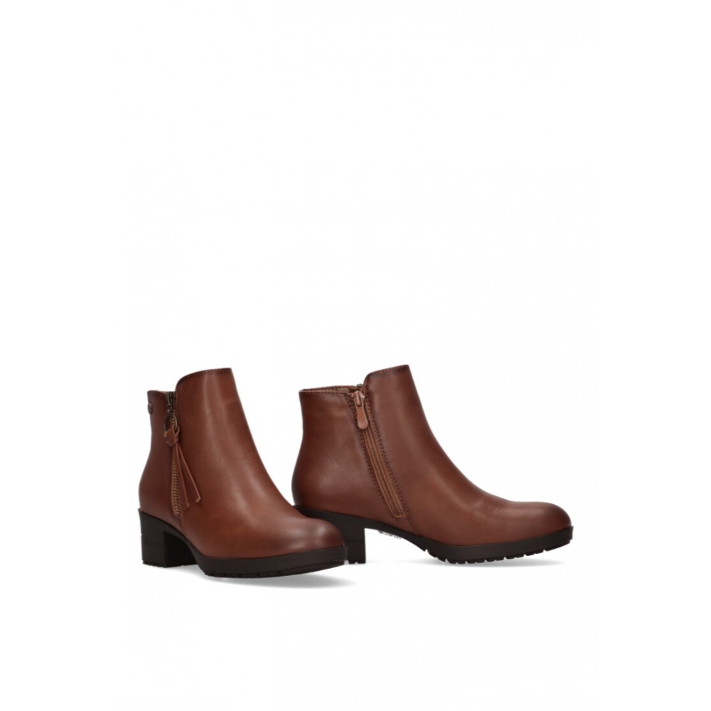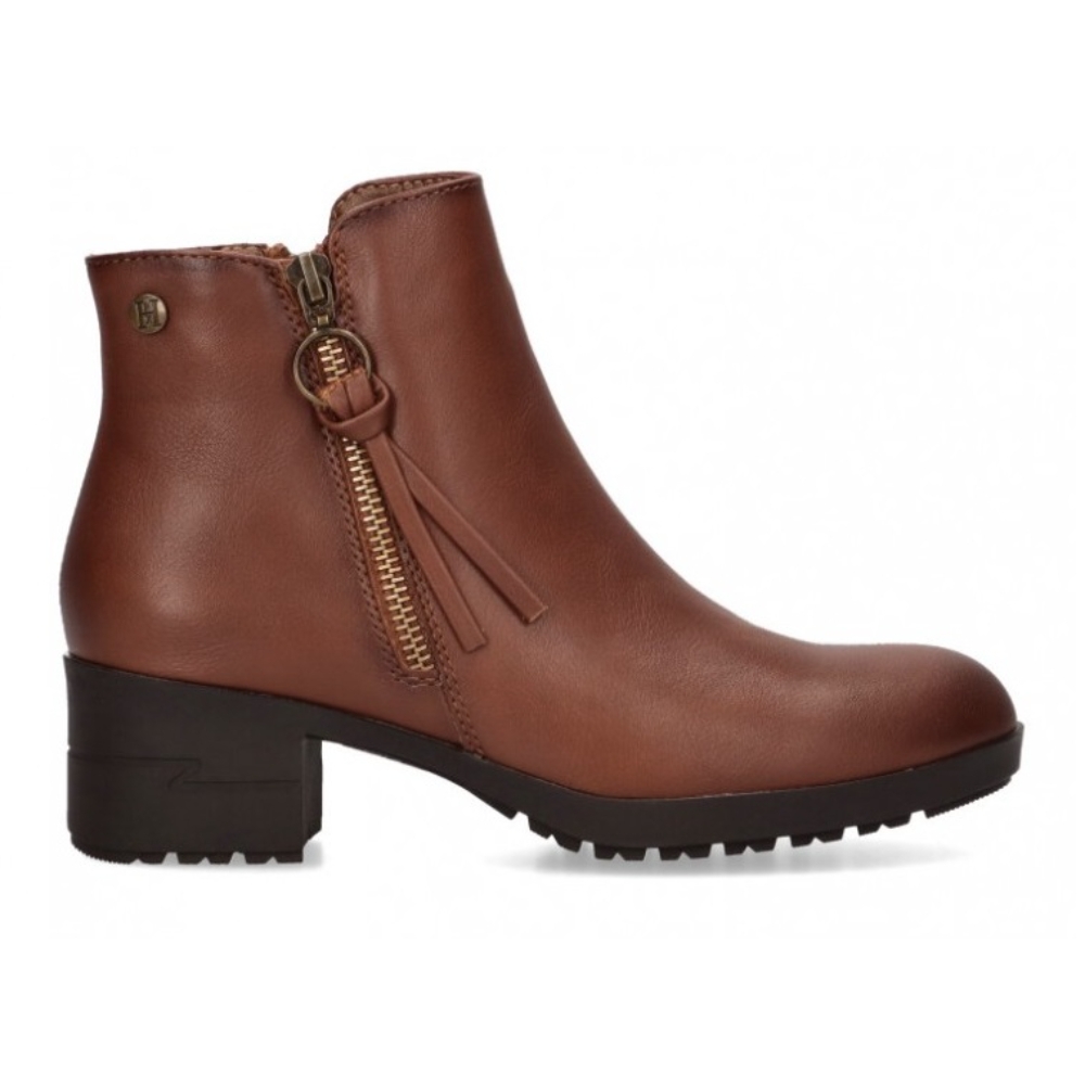 Botin con tacón bajo de la marca Hispaflex para mujer. Fabricado en material sintético con cremallera lateral. Color cuero