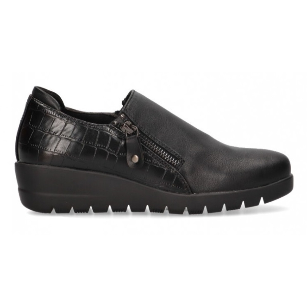 Zapato confort de la marca Hispaflex para mujer. Fabricado en material sintético con cremalleras laterales y suela de goma. Color negro