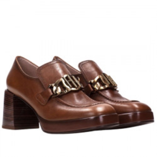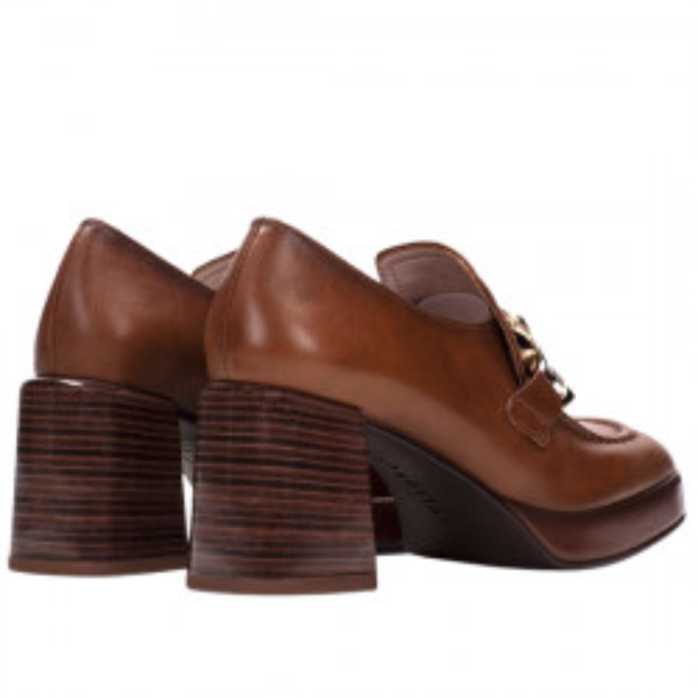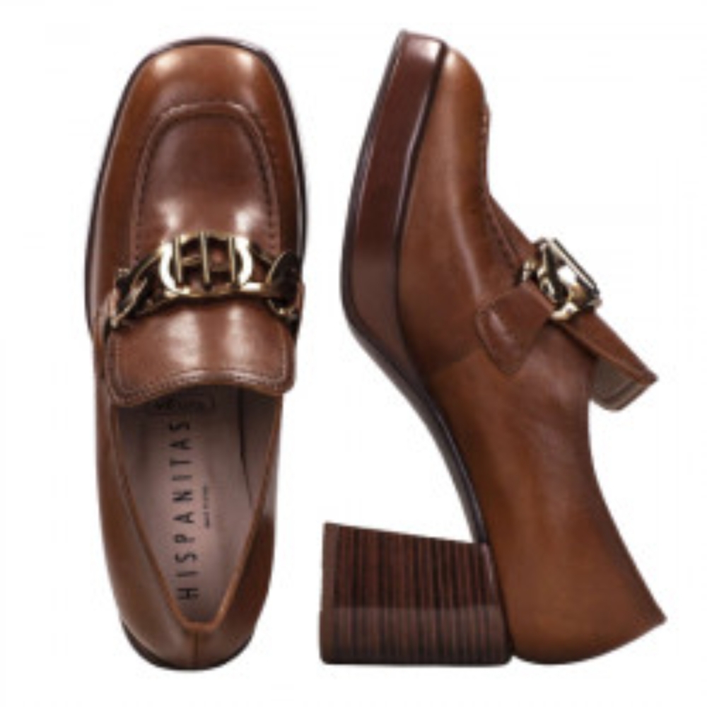 Mocasín con tacón alto de la marca Hispanitas para mujer. Fabricado en España con piel de gran calidad. Color cuero