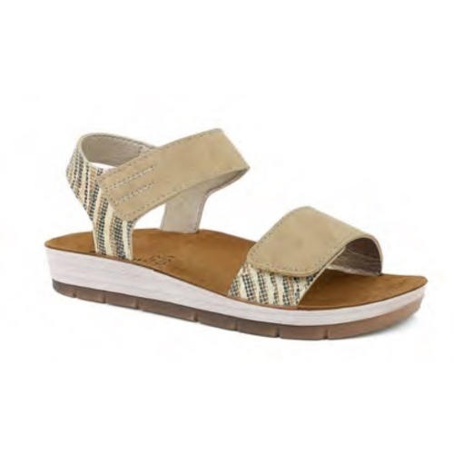 Sandalia con posibilidad de ajuste con doble velcro. Plantilla y suela amortiguadora y flexible en PIEL AUTÉNTICA suave.