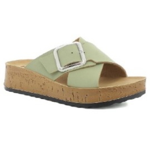 Zueco destalonado con cuña baja y tiras cruzadas en el empeine. Su hebilla aporta un mejor ajuste. Plantilla tipo bio acolchada para una mayor comodidad en cada pisada