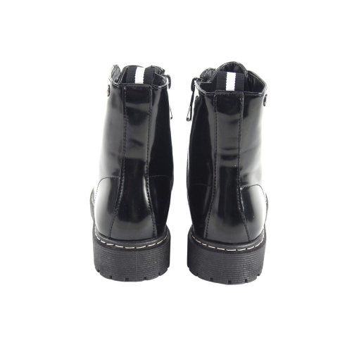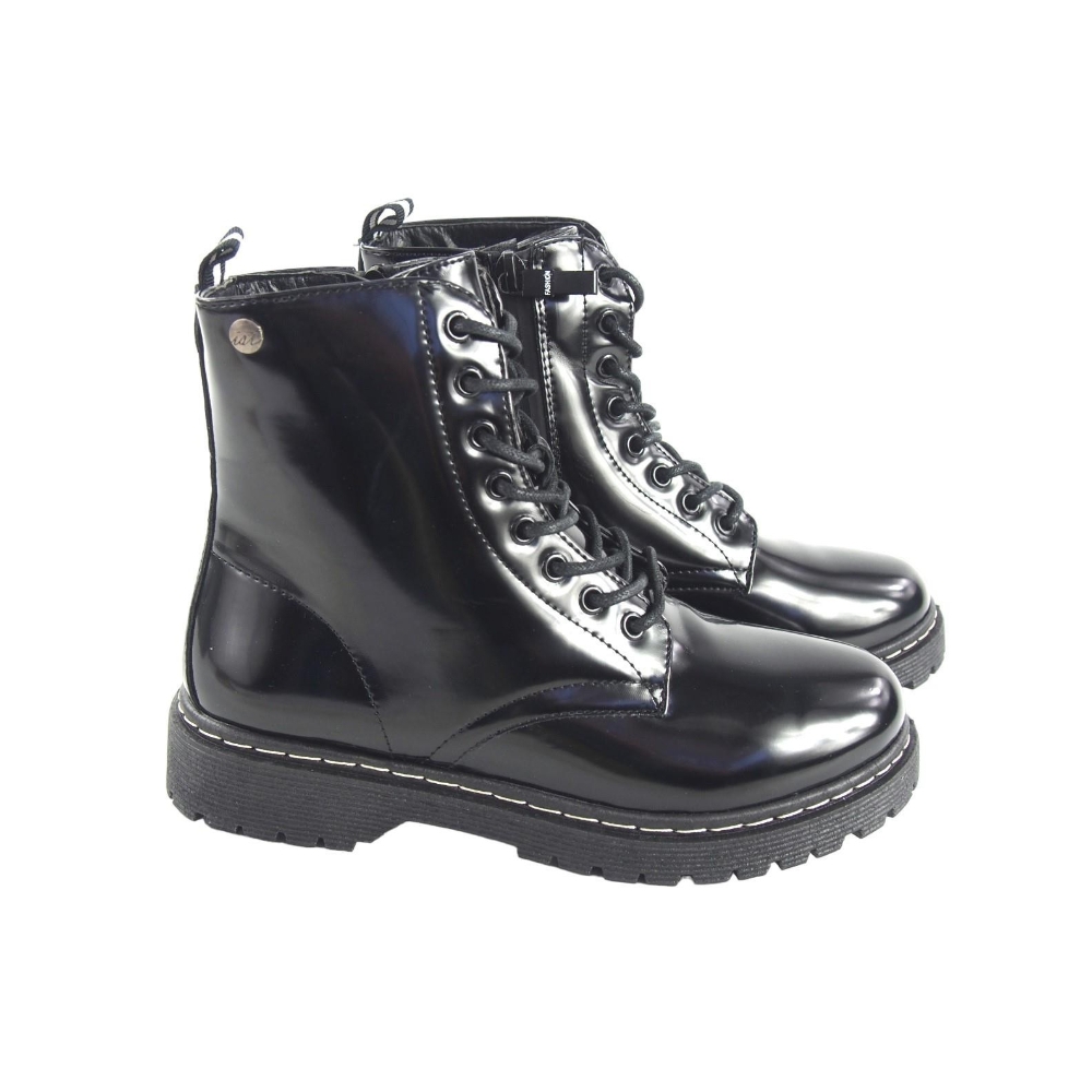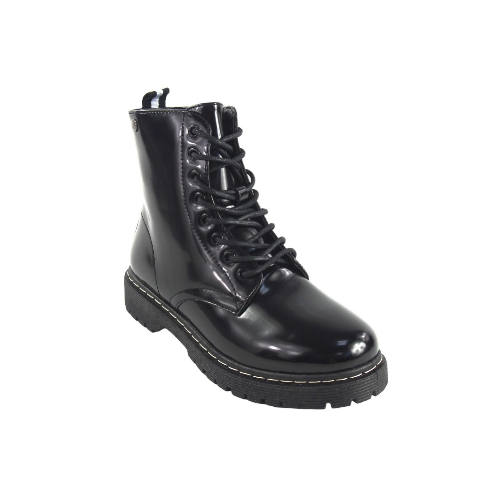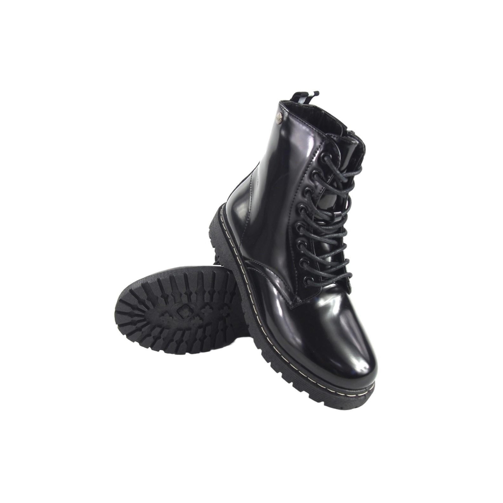 Botin militar para mujer. Fabricado en material sintético tipo brillo con cordón. Color negro