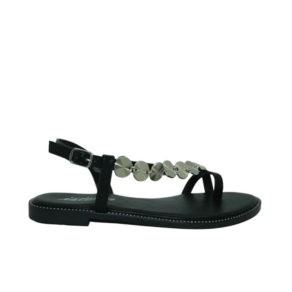 Sandalia de mujer fabricada con materiales sostenibles en color marron con apliques de monedas doradas y hebilla.