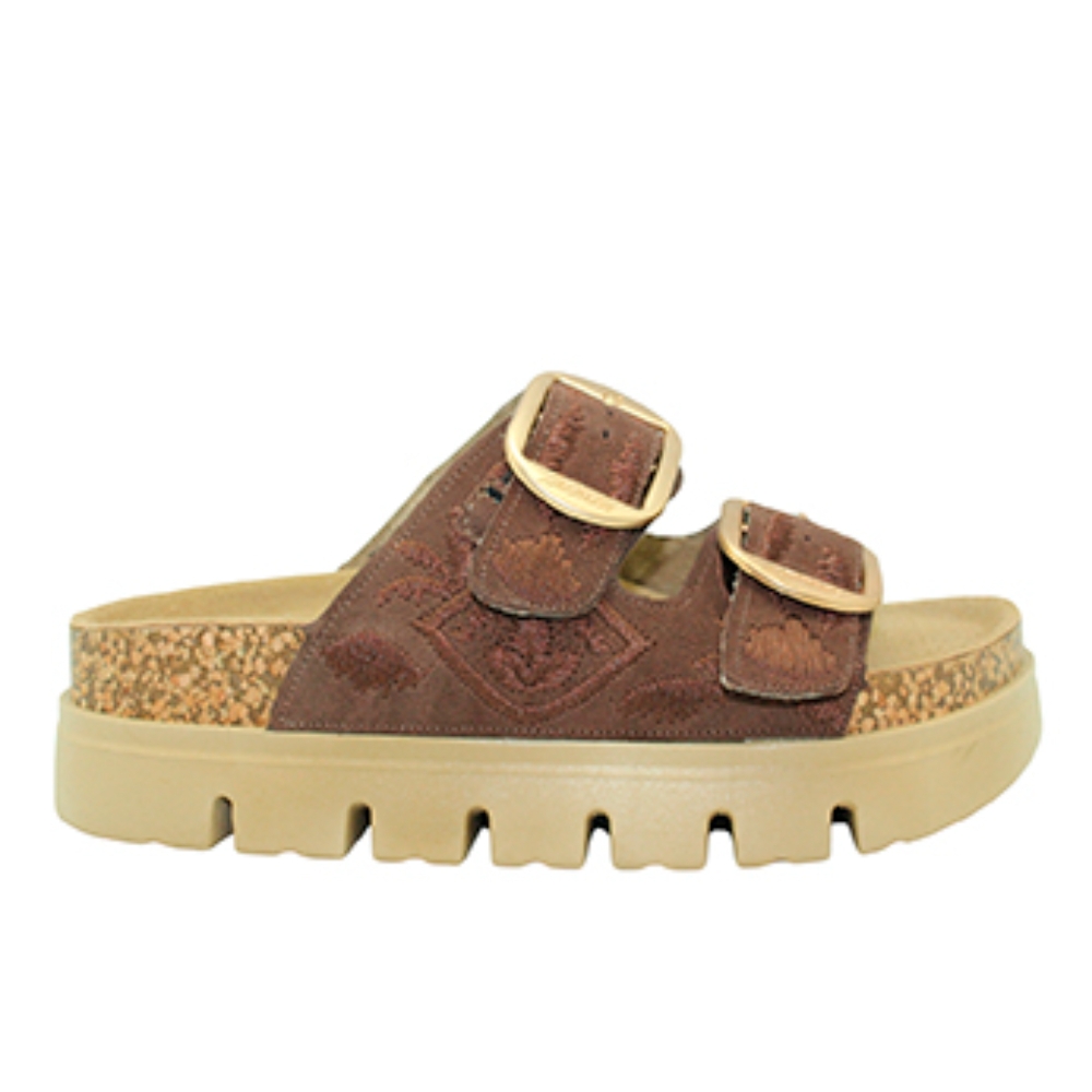 Zueco con plataforma y dos hebillas de la marca Isteria para mujer. Fabricado en materiales de gran calidad con suela dentada, moderna y muy cómoda para tus días más calurosos. Color moka