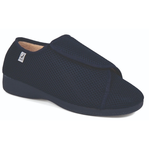 Zapatilla de ancho especial con velcro en el empeine para una mayor apertura y comodidad en cada puesta. Fabricada en material textil con suela de goma flexible y antideslizante. Color marino