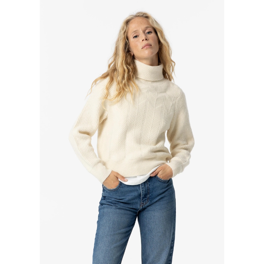 Jersey de punto con cuello alto y manga larga. Aplicación hilo metalizado combinado a contraste.