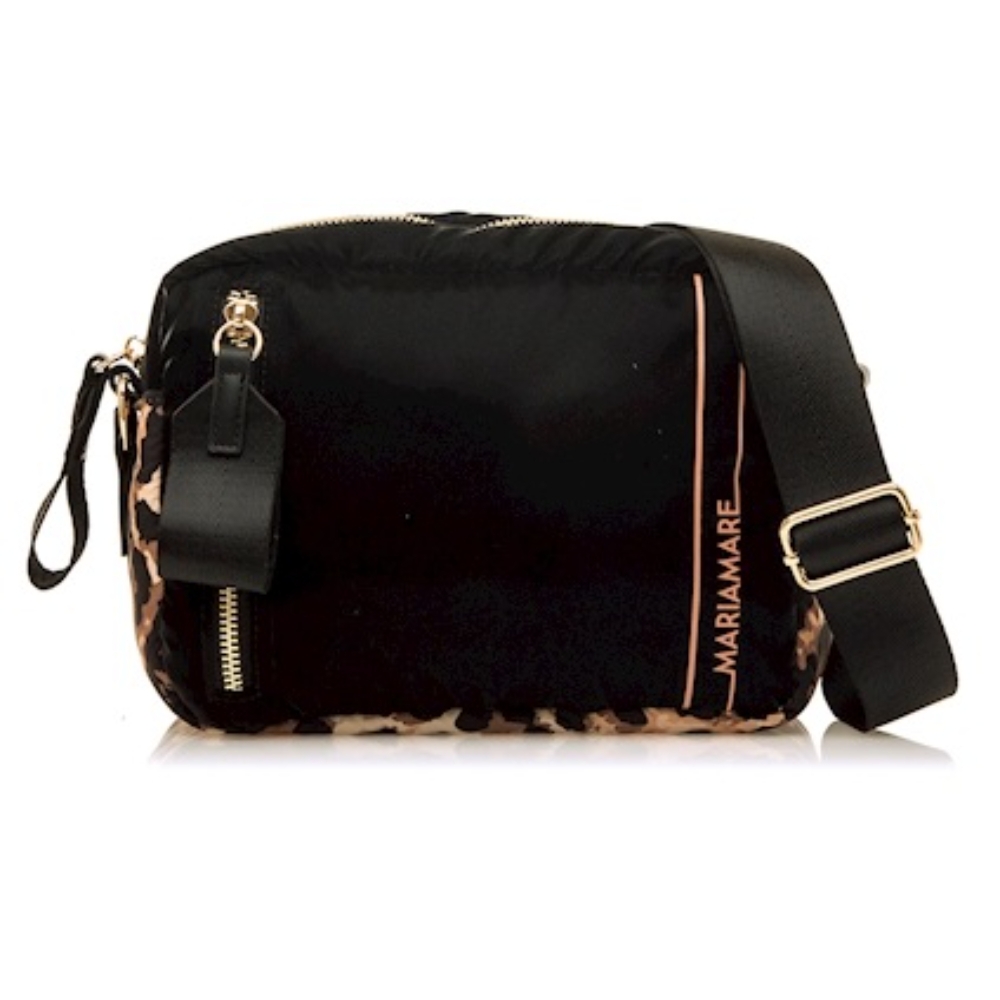 Bolso bandolera de mujer de la marca Mariamare, modelo Aure de color negro, con un estilo urbano y detalles en estampado animal print. Fabricada en nylon negro con aplicaciones de estampado de leopardo, añade un toque de carácter a tus looks diarios. Dispone de un compartimento principal con cierre de cremallera en dorado y un bolsillo exterior para mayor practicidad. La correa ajustable permite un ajuste cómodo, ideal para llevar cruzada o al hombro en cualquier ocasión.