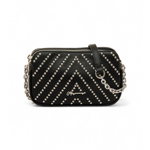 Bandolera de color negro para mujer, modelo Mones de la marca Mariamare. Su diseño compacto destaca por el patrón de tachuelas metálicas en forma de espiga, que aporta dinamismo y un toque atrevido. Incluye una cadena plateada con refuerzo al hombro para mayor comodidad. El logo de la marca aparece discretamente en plateado en el frontal. Perfecto para añadir personalidad a tus looks y llevar lo esencial con estilo.