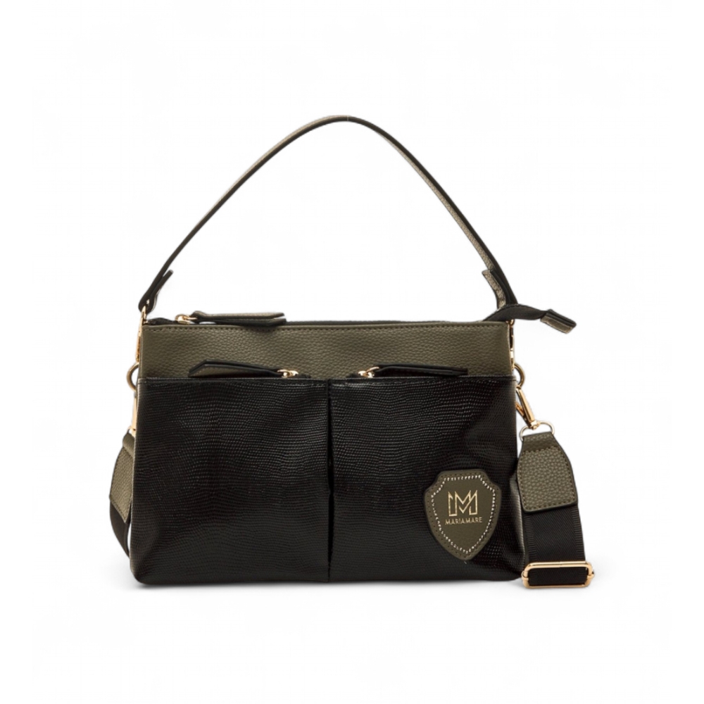 Bolso bandolera de color verd para mujer, modelo Nila de Mariamare. Este diseño combina funcionalidad y estilo gracias a sus múltiples bolsillos frontales con acabado brillante y cierre de cremallera. Cuenta con asa superior, que permite llevarlo al hombro, y correa ajustable para usarlo cruzado. Con acabado texturizado, ofrece un formato compacto pero con buena capacidad para llevar lo esencial siempre a mano. El detalle del logotipo en relieve le da un toque distintivo sin sobrecargar el diseño.