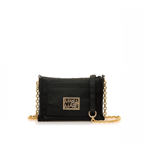 Bolso de color negro para mujer de la marca Mariamare modelo Dauma de estilo bandolera. Su diseño compacto con estructura rectangular lo convierte en una opción ideal para salidas rápidas o eventos donde solo se necesita lo esencial. Incluye una cadena dorada, que aporta un toque moderno y contrasta con el tono oscuro del cuerpo del bolso. El logo metálico sobre el bolsillo frontal añade un punto distintivo y elegante, manteniendo la funcionalidad gracias al cierre con cremallera superior.