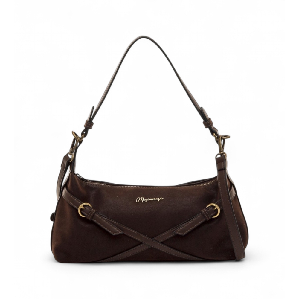 Bolso bowling para mujer de Mariamare, modelo Bette de color marron. Este modelo es una opción versátil para diferentes ocasiones gracias a su diseño funcional y chic. Incorpora asa corta para llevar al hombro y correa larga para utilizar como bandolera. Los detalles de cinturones cruzados en la parte frontal con hebillas doradas aportan un toque moderno. Su forma alargada y cierre superior con cremallera permiten llevar lo esencial de forma segura y cómoda.
