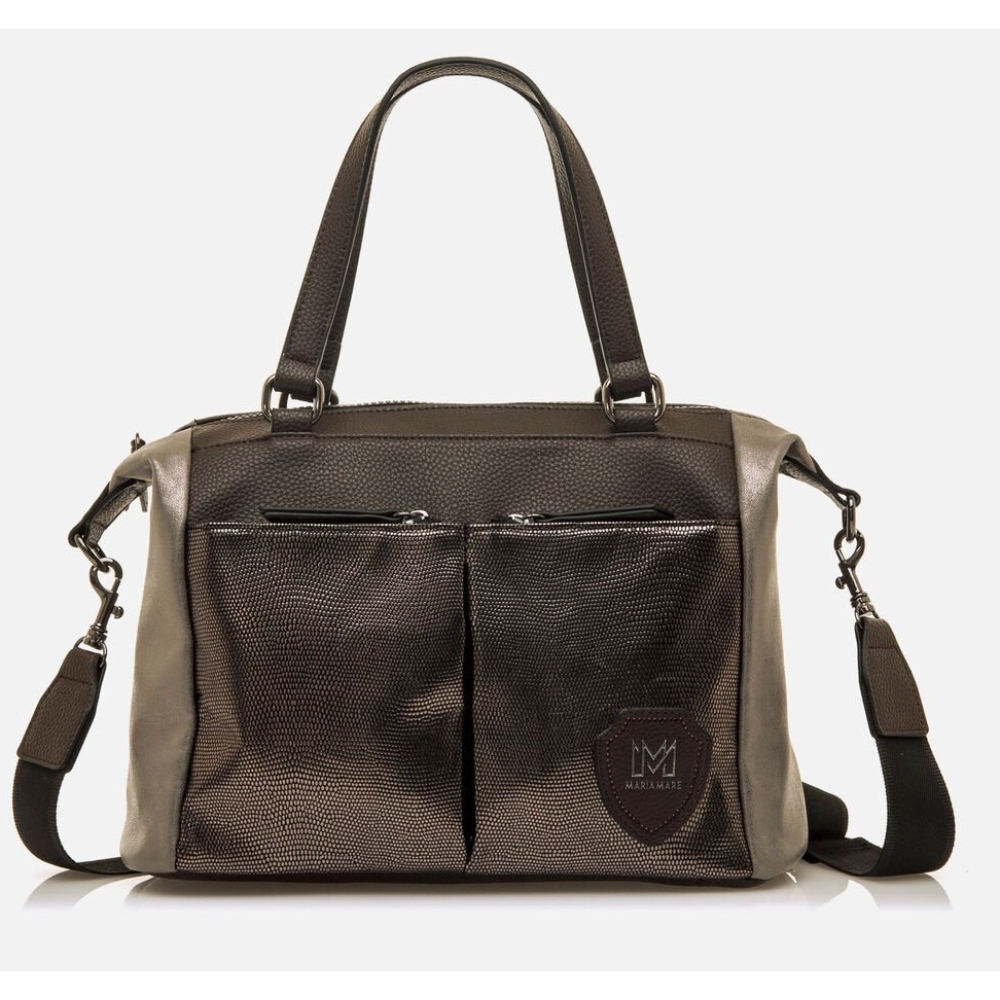 Bolso bowling de color moka con detalles plara para mujer modelo Nieve de Mariamare. Su diseño combina paneles con texturas contrastadas y un acabado metalizado que aporta un toque moderno. Dispone de dos bolsillos frontales con cremallera para un acceso rápido y funcional, además de doble asa de mano y correa larga ajustable para mayor versatilidad. El escudo con el logo de la marca se integra en la parte frontal como detalle decorativo. Ideal para el uso diario por su amplio formato y estilo urbano.