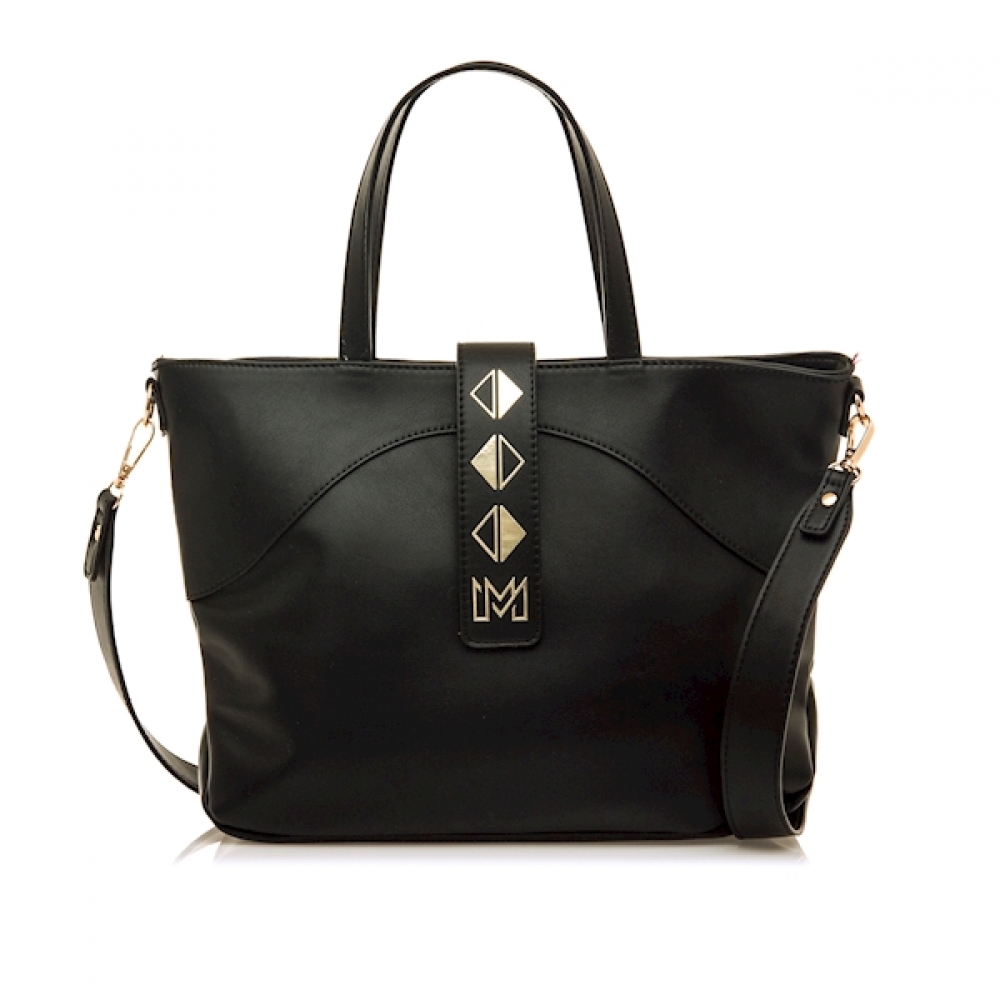 Bolso shopper de color negro para mujer de Mariamare, modelo Malla. Su diseño estructurado incorpora una tira central con tachuelas geométricas y el logotipo metálico de la marca, añadiendo un toque distintivo. Dispone de asas cortas para llevar en la mano y una correa larga ajustable para mayor versatilidad. El cierre superior con cremallera junto al cierre de botón magnético de la tira frontal, asegura el contenido, mientras que su formato amplio lo convierte en una opción práctica para llevar todo lo necesario.