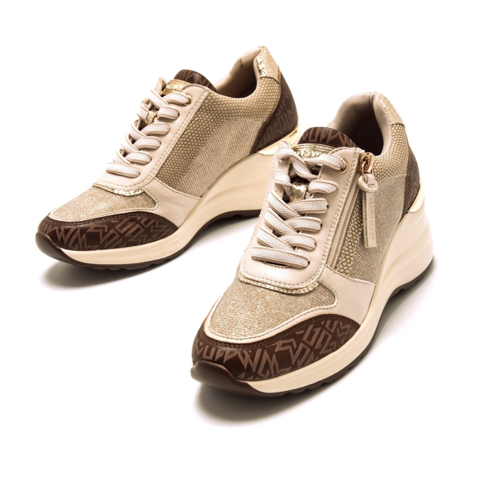 Zapatos de cuña beig para mujer, modelo Cinzia de Mariamare. Presentan detalles en marrón con el logo estampado y detalles dorados en el tacón. La combinación de cierre de cordones y cremallera lateral aporta practicidad y un estilo urbano moderno, ideal para el día a día.