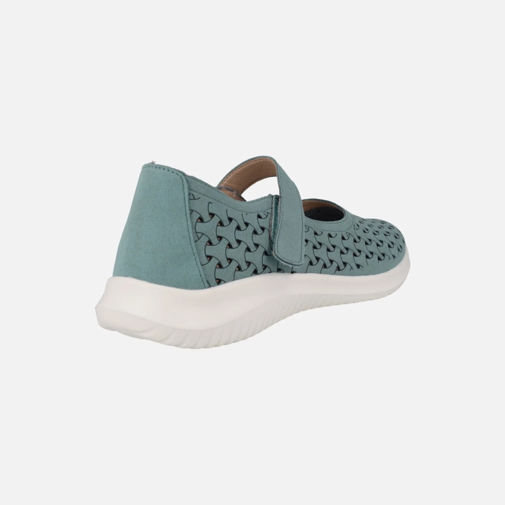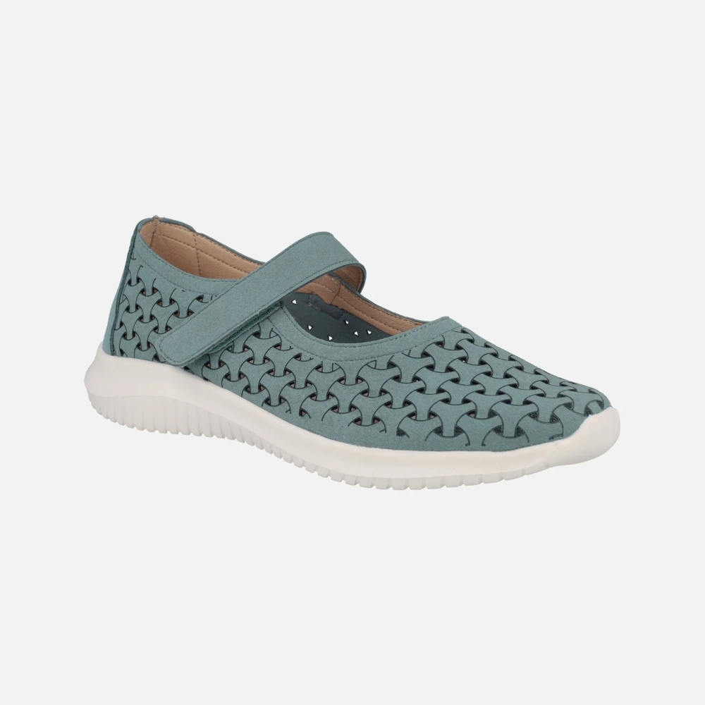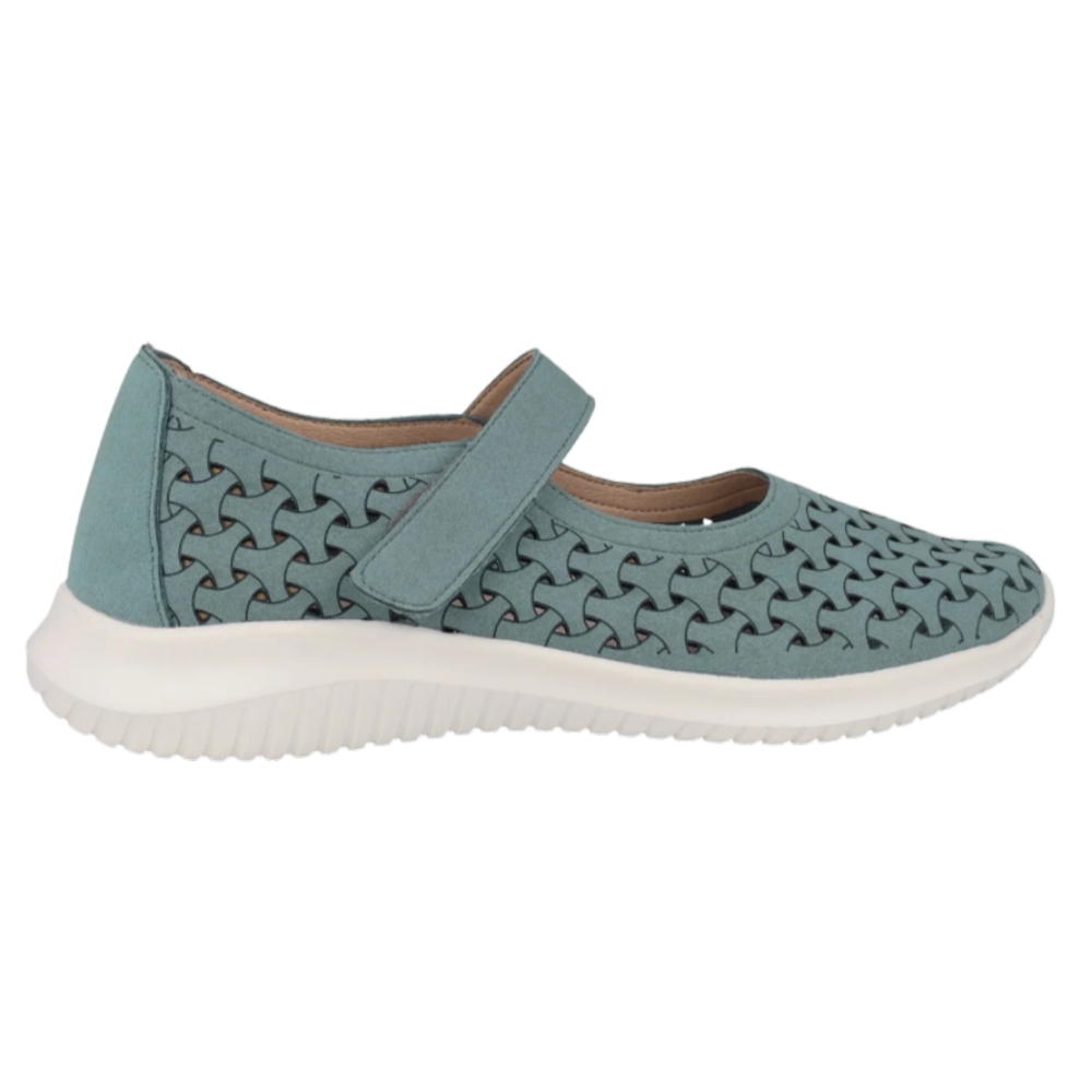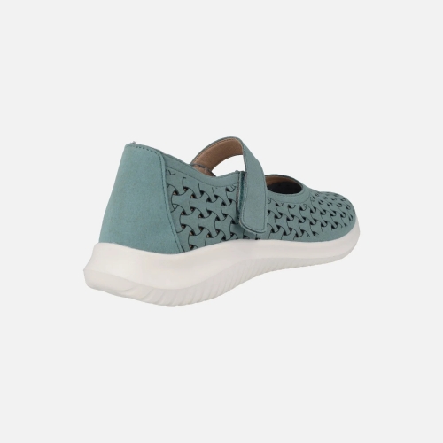 Zapatillas deportivas para mujer estilo merceditas de la marca Ecoligeros modelo Isa. Mercedes elaboradas en materiales sintéticos, con dibujos a láser y picados, cierre de velcro. Interiores en combinado de sintéticos y piel. Piso de goma super ligero, con una altura trasera de 3 cms. Disponibles en oro, azul jeans y beige.