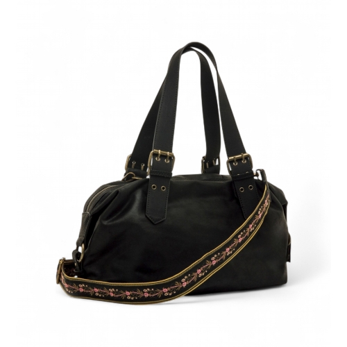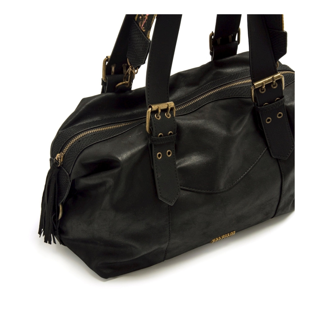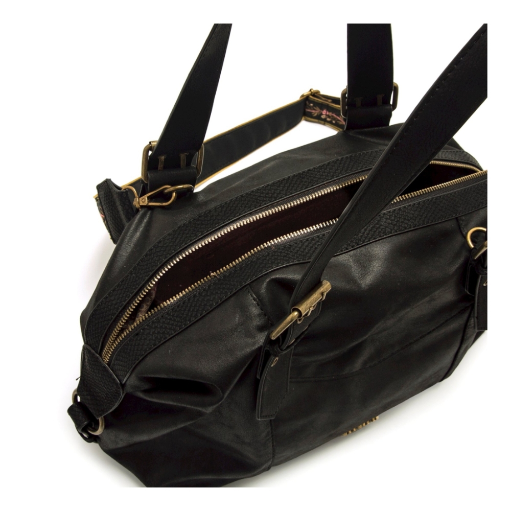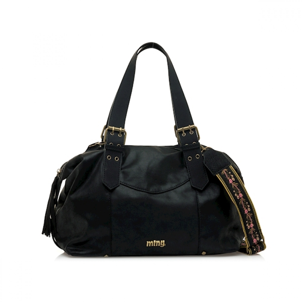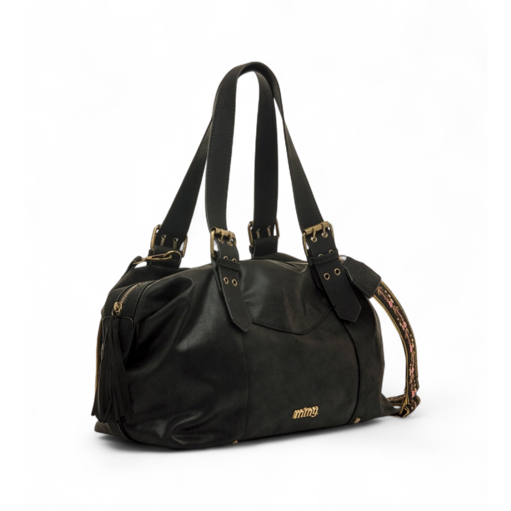 Bolso de color negro para mujer de mtng, modelo Sanny de estilo boho casual. Este diseño tipo bowling incorpora doble asa reforzada con hebillas metálicas y una correa regulable con estampado floral que permite llevarlo al hombro o cruzado. El cuerpo del bolso tiene un acabado envejecido que le da un aire desenfadado y versátil. Su interior espacioso con cierre de cremallera lo convierte en una opción práctica para diario o escapadas sin renunciar al estilo.