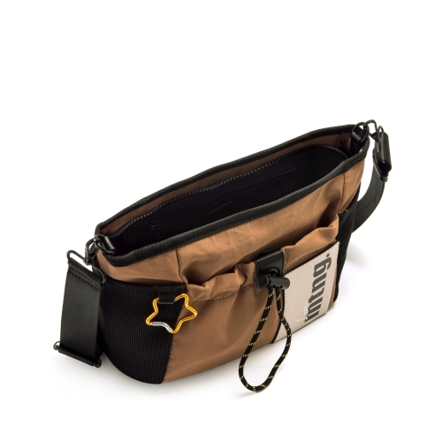 Bolso bandolera negro para mujer, modelo Noca de mtng. Con un diseño funcional, destaca por sus bolsillos laterales de red y detalles en contraste como el mosquetón metálico en forma de corazón y el cordón con cierre ajustable de color morado. Incluye parche decorativo con el logo ?Love mtng.? en la parte frontal. Cierre superior con cremallera y bandolera regulable para mayor comodidad. Su interior forrado incorpora un bolsillo con cremallera. Perfecto para acompañarte en tus planes más casuales con un toque sporty y actual.