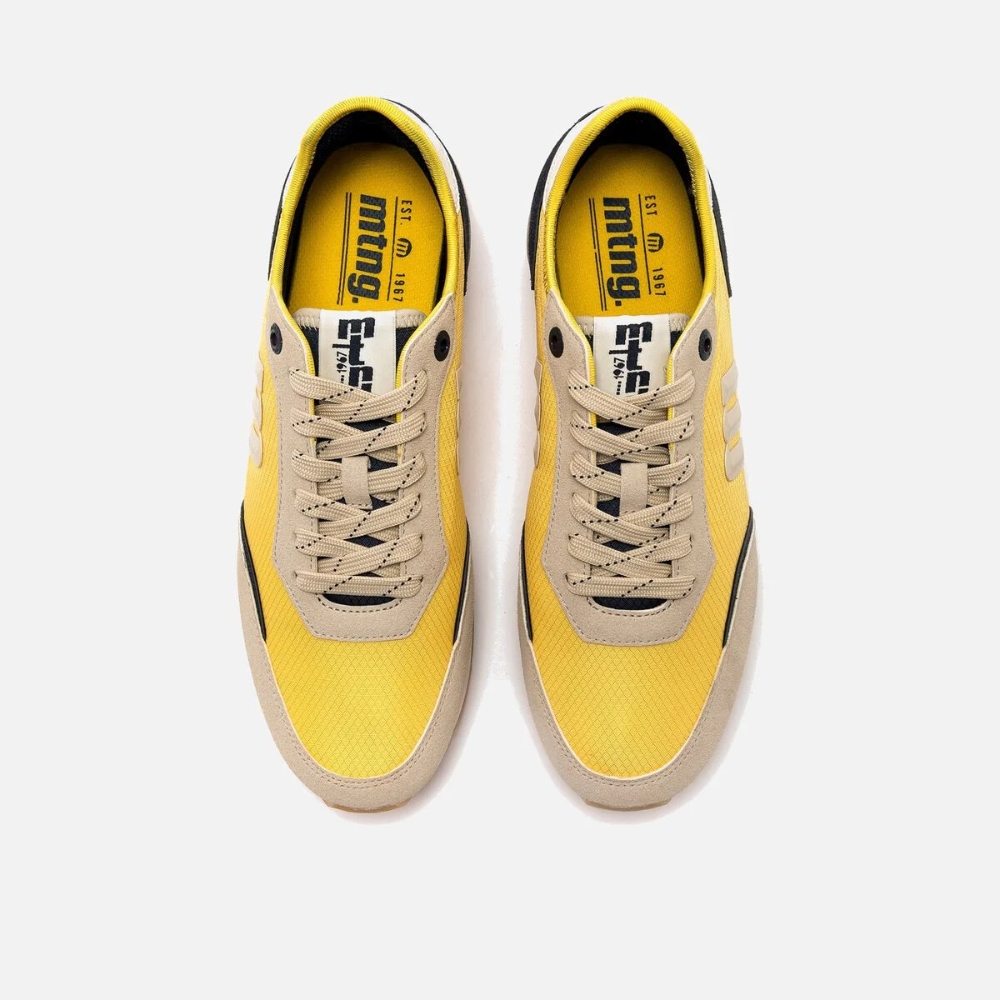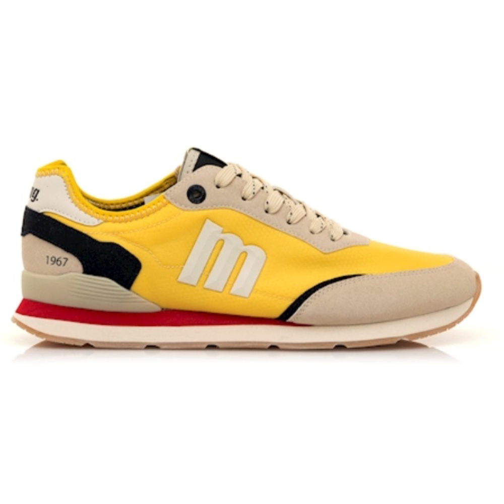 Zapatillas de color amarillo con detalles beige y negro para hombre de la marca Mustang, modelo Joggo Classic, con inspiración retro running. Su diseño combina paneles en contraste y una suela con franja roja que aporta un estilo dinámico y juvenil. Incorpora logotipo lateral en relieve, talonera con inscripción '1967' y ojales metálicos que refuerzan su carácter deportivo. Equipadas con plantillas con tecnología Starfit, que mejoran la comodidad en cada paso.