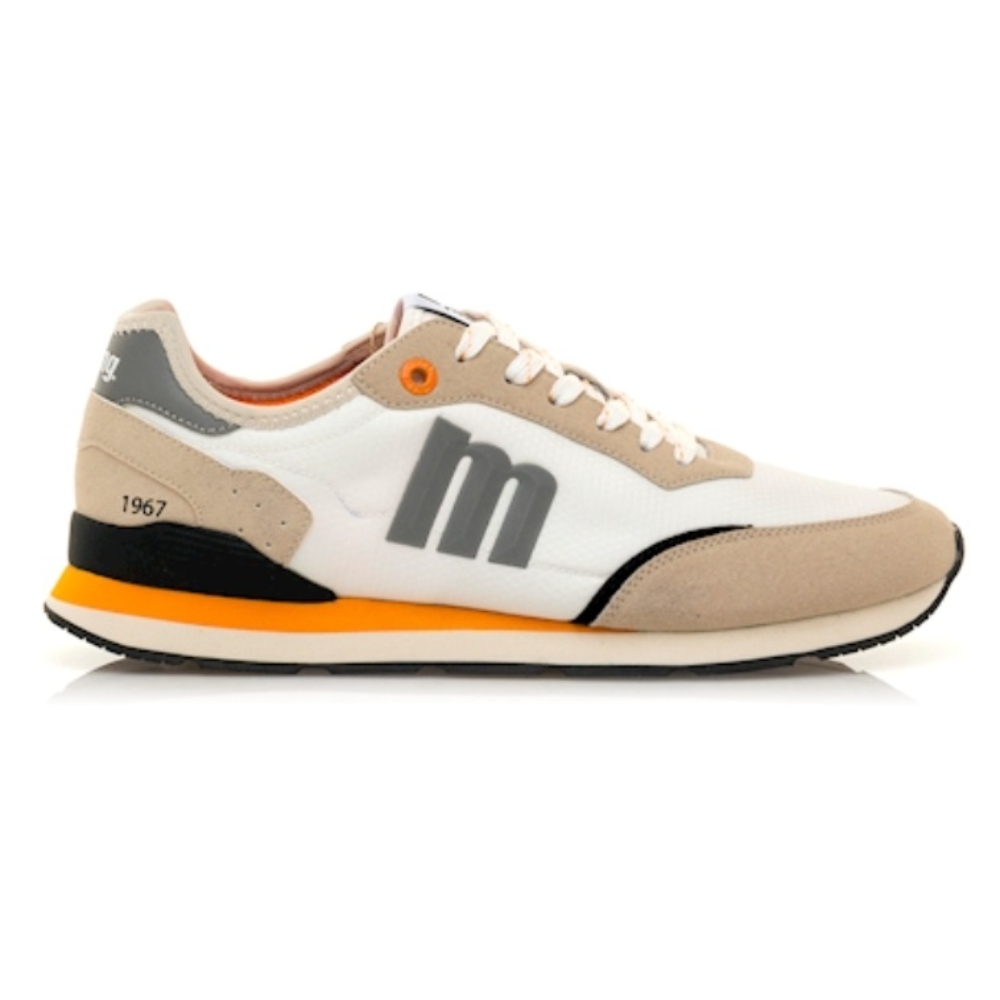 Zapatillas para hombre de la marca Mustang, modelo Joggo Classic de estilo retro running de color blanco con detalles beige. El diseño combina tonos neutros con acentos en gris, negro y naranja para un look deportivo con personalidad. Incluye el logo lateral en relieve y plantillas con tecnología Starfit, que mejoran la comodidad en cada paso. Gracias a su construcción ligera y diseño versátil, es una opción cómoda perfecta para quienes buscan funcionalidad con un toque moderno.