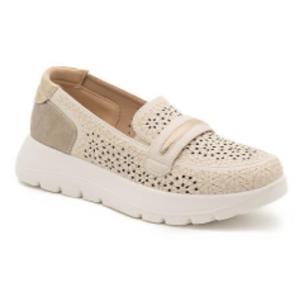 Descubre la combinación perfecta de estilo y confort con estos elegantes mocasines para mujer. Fabricados en piel sintética de calidad, su diseño picado con delicadas figuras florales aporta un toque sofisticado y femenino. Su ligereza es incomparable gracias a la suela EVA ultraligera en color blanco, que contrasta de manera armoniosa con el tono beige del calzado.
