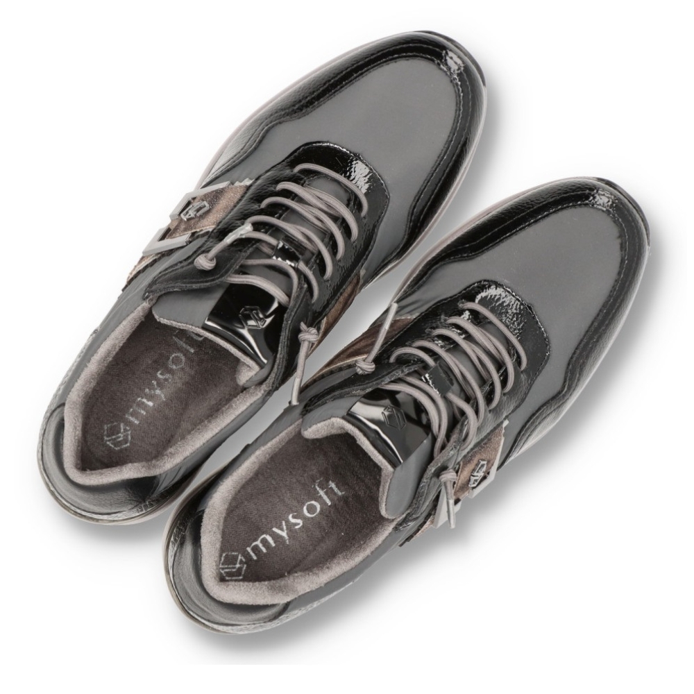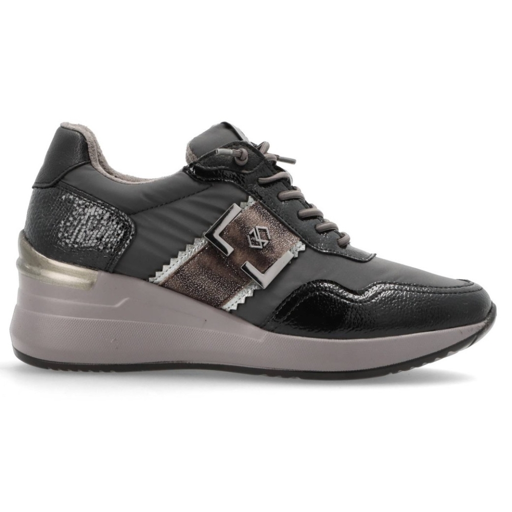 Zapatillas deportivas para mujer 25M591 de MYSOFT. De PU Leather y detalles print anímal. Con cierre de cordones y cuña de unos 6cm de altura. Interior en tejido suave, con plantilla extraible memory foam que aporta un plus a la pisada, haciendola más comoda.