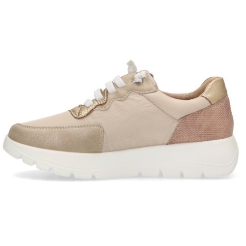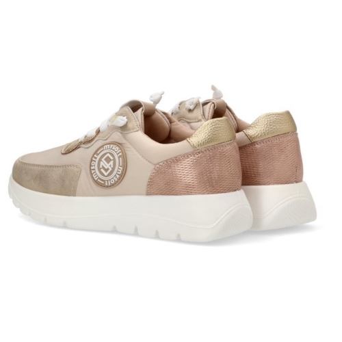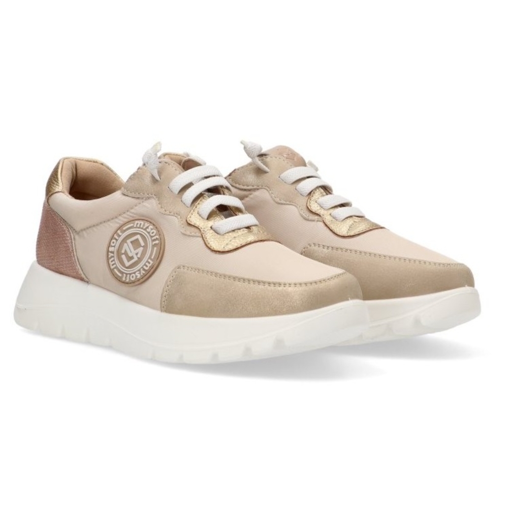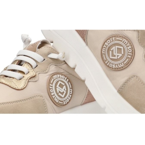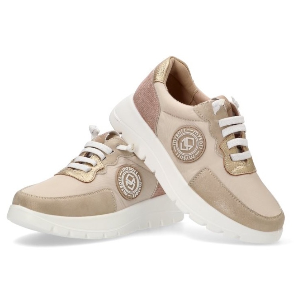 Zapato estilo confort con suela deportiva de la marca de Mysoft para mujer. Fabricada en material sintético ligero y transpirable con gomas elásticas en el empeine para un mayor agarre y sujección. Color beig