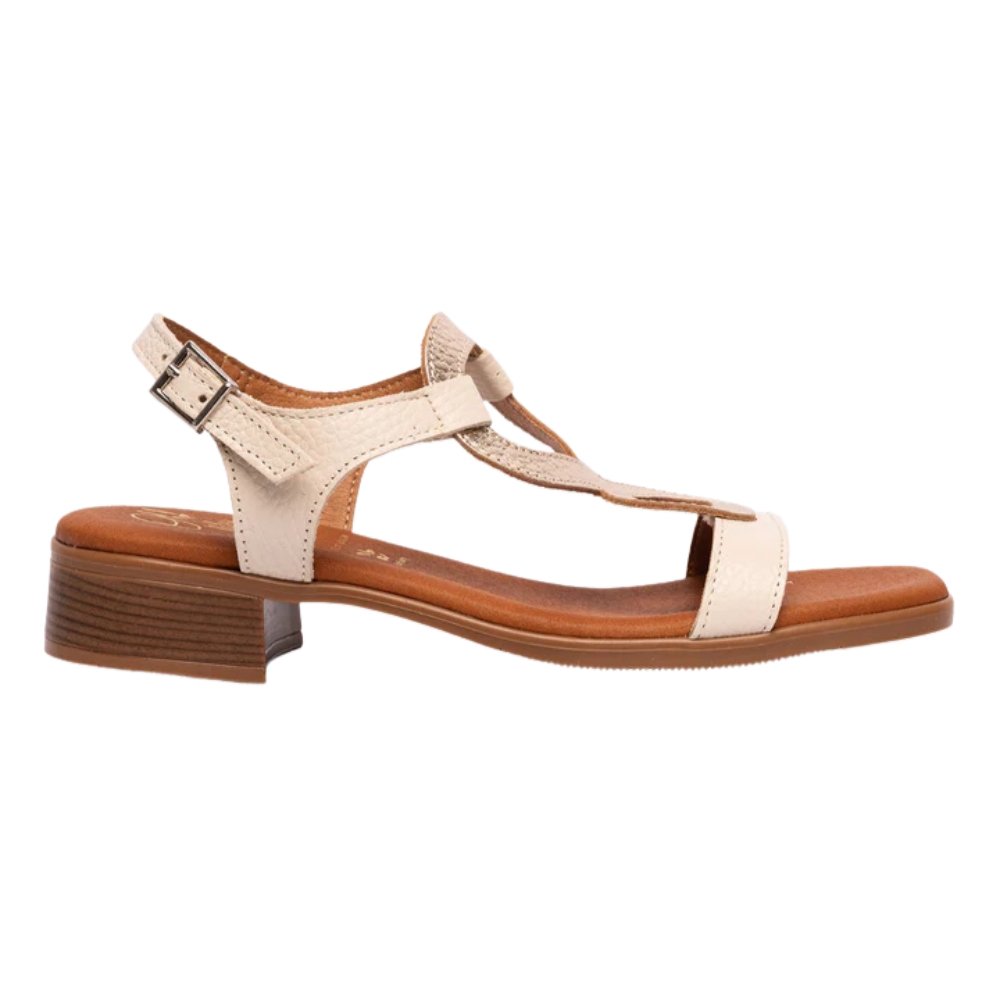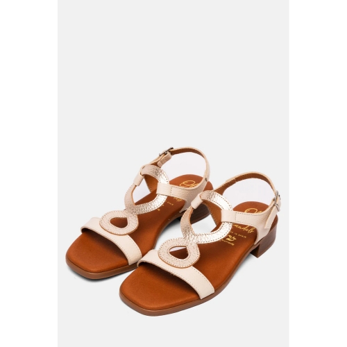 Sandalia de mujer con tacón fabricada en piel de color hielo y cava. El modelo Leila destaca por su diseño elegante, con pieza en forma de ocho invertido en el empeine, confeccionado en piel con un suave grabado y cierre de hebilla. ¡Te sorprenderá la comodidad de estas sandalias!