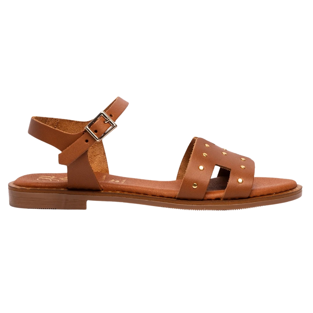 Sandalia plana con cierre de hebilla para mujer. Fabricada en España con piel de gran calidad, plantilla de gel extra blandita y acolchada para una mayor comodidad. Color marron