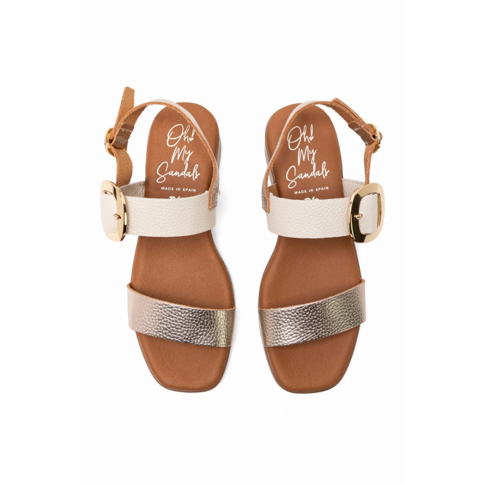 Sandalia de mujer con tacón fabricada en piel. Diseño en tiras color champán y hielo, con un suave grabado sobre la piel y dos hebillas doradas para un ajuste perfecto. El modelo Leticia es ideal para ofrecer estabilidad y amortiguar tu pisada gracias a su planta acolchada de microfibra transpirable y su suela de goma flexible y antideslizante.