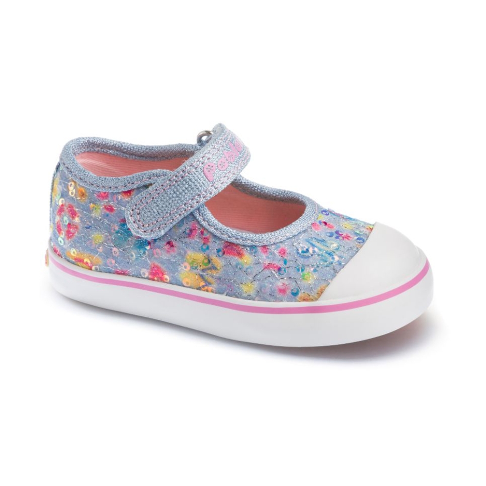 Merceditas de lona para niña. Fabricada en material textil transpirable con velcro y puntera de goma. Plantilla de piel. Color azul