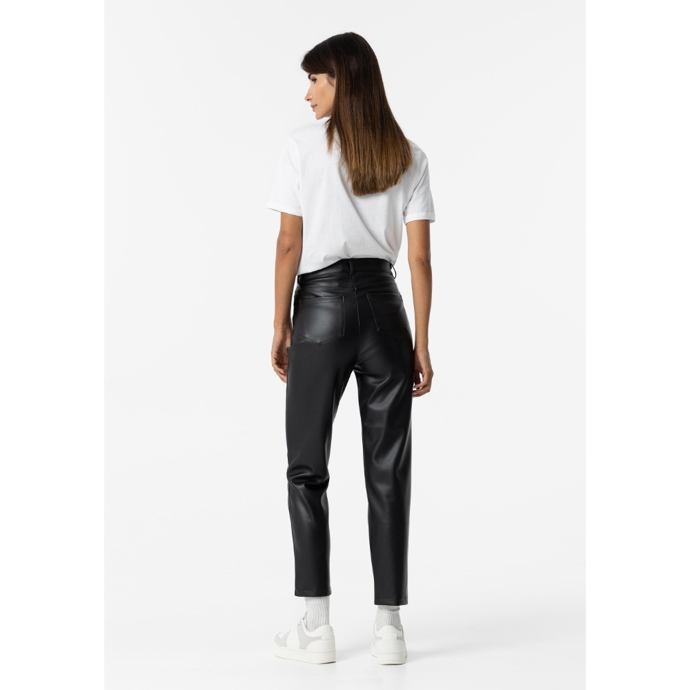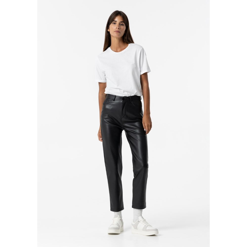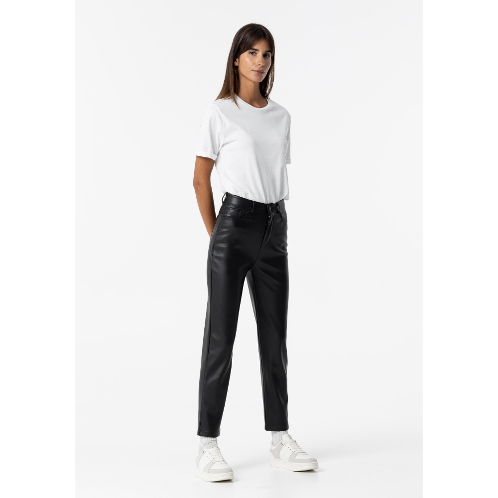 Pantalón con cinco bolsillos. Cierre frontal con cremallera y botón.
