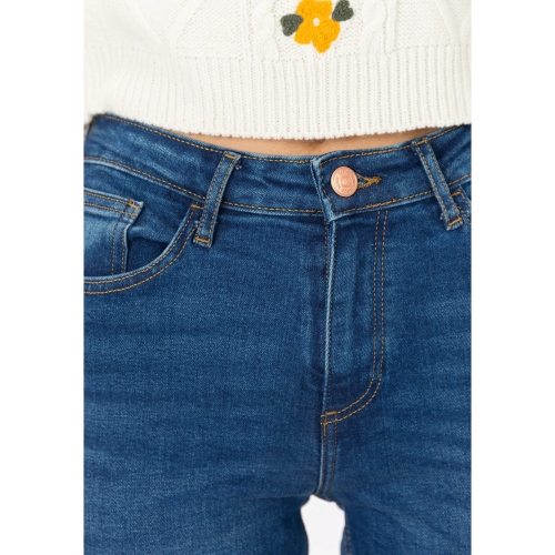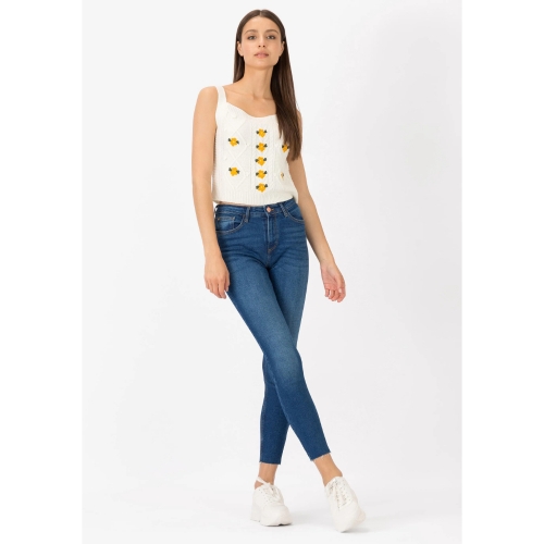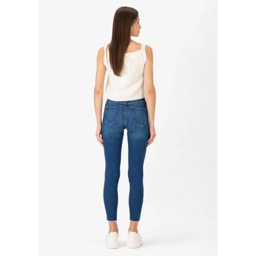 Jeans ajustados de tiro alto con cinco bolsillos. Cierre frontal con cremallera y botón metálico. Bajo desflecado.