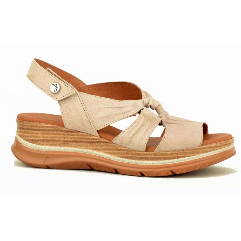 Sandalia de mujer con cuña, piel de gran calidad y plantilla acolchada. Cierre mediante velcro. Color piedra.