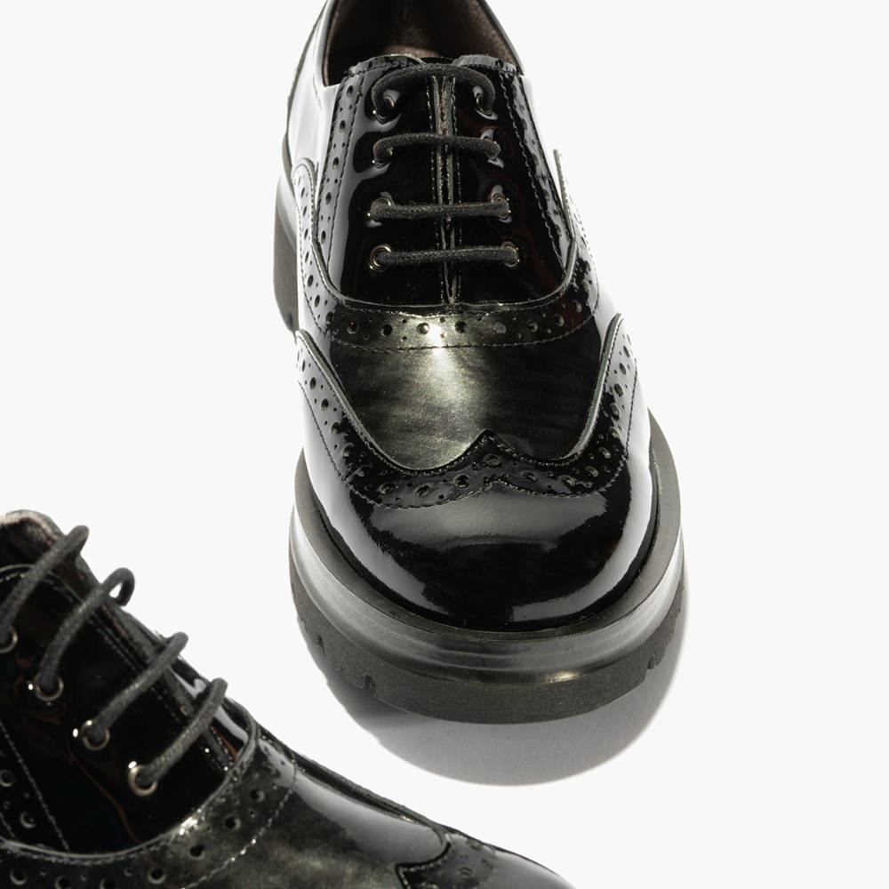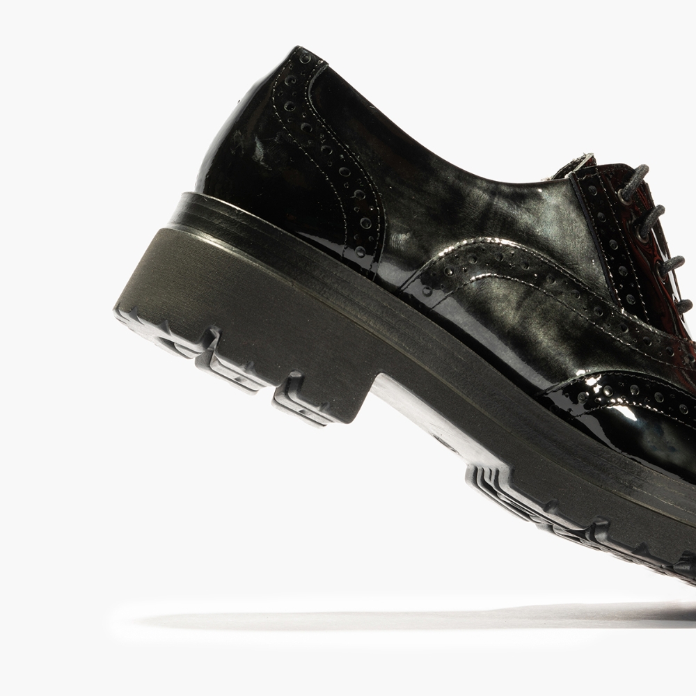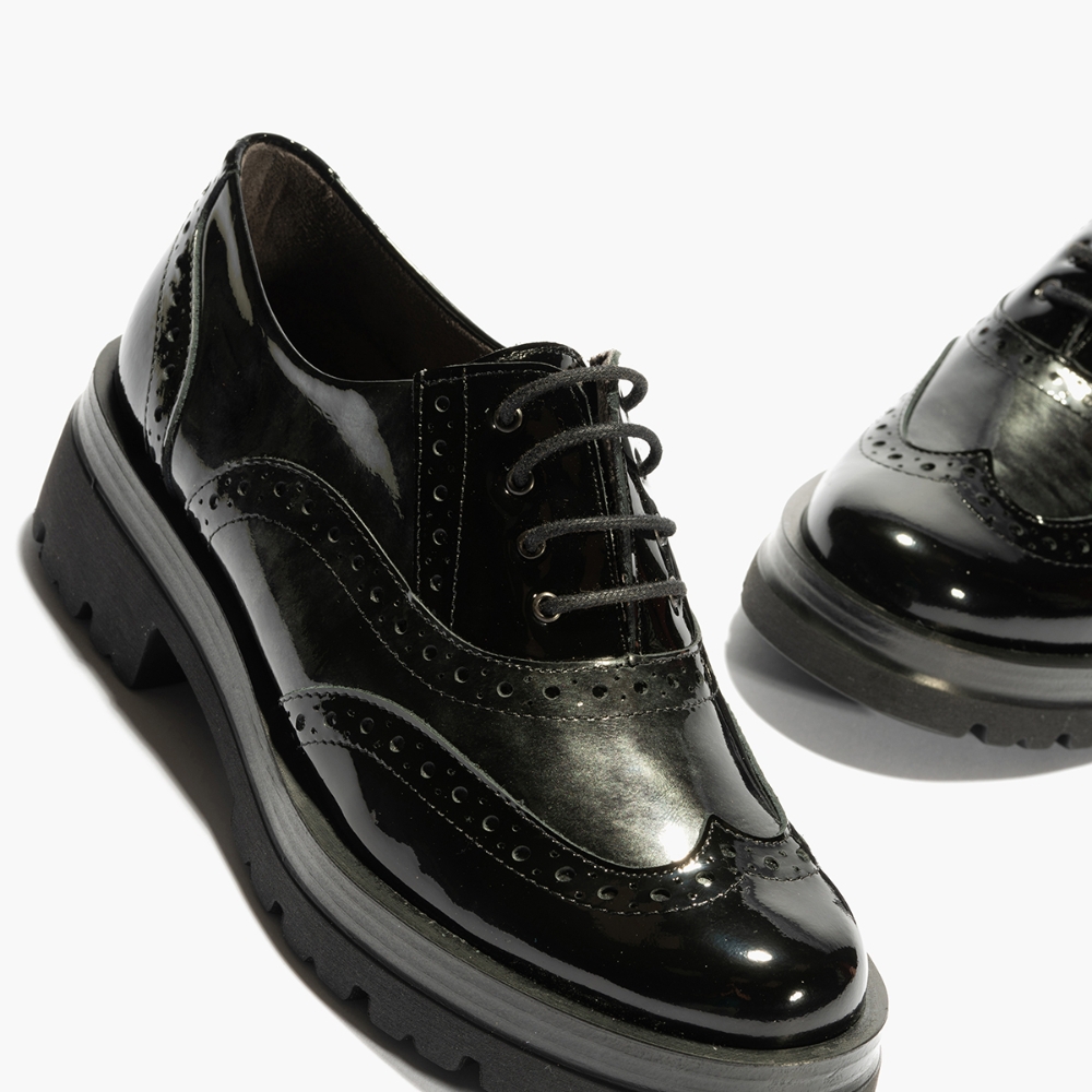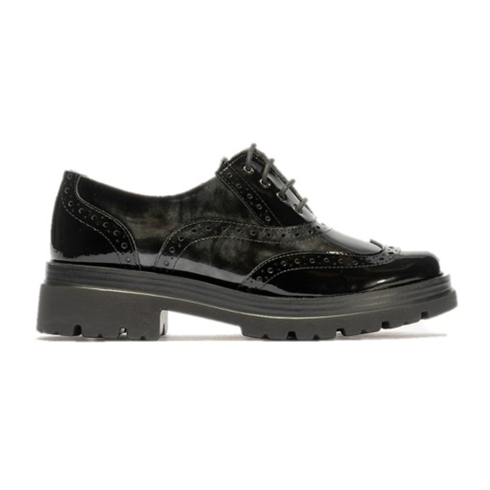 Zapato tipo blucher con cordón de la marca Pitillos para mujer. Fabricado en España con piel tipo charol y forro interior en textil para una mayor suavidad y comodidad. Color negro